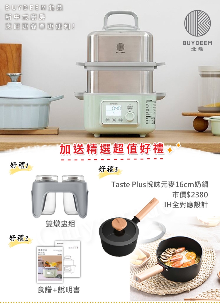BUYDEEM 北鼎為忙碌的現代人設計了一款“省時、方便、全自動”的多功能蒸燉鍋。不論蒸、燉、做優格或副食品,1 台抵6 台,多種料理一次搞定!
