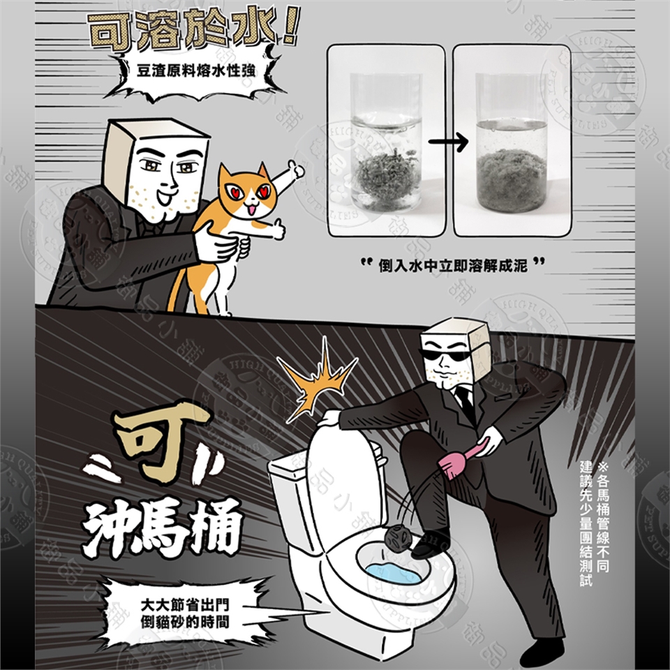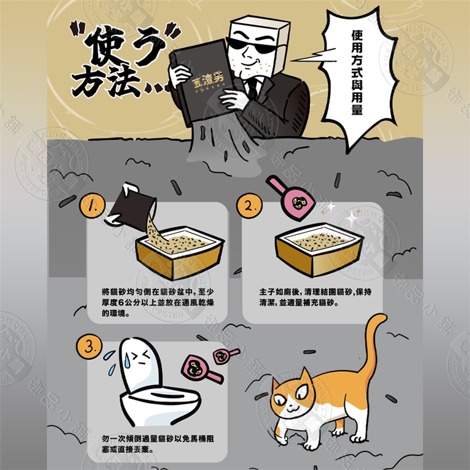 豆渣男 除臭速吸豆腐砂 低粉塵, 強力凝結的功能 有綠茶 / 活性碳兩種,綠茶香氣可讓便盆周圍充滿芳香,不讓臭味殘留,活性碳則特別適合排泄味道較重,或室內較不通風的環境使用。