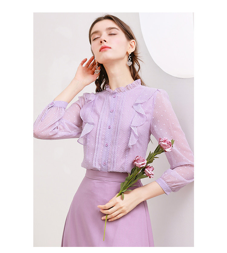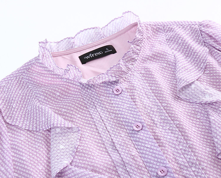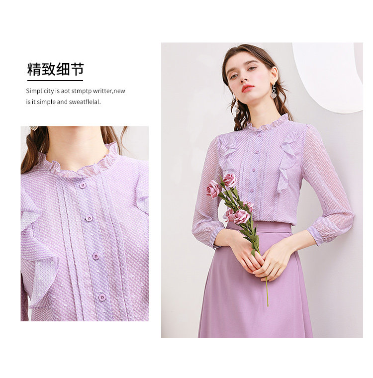 | 木耳邊圓領、對稱的荷葉邊結合門襟處壓褶裝飾,既添加層次感,又抒發著穿著者的甜美氣質,也更方便穿脫! |