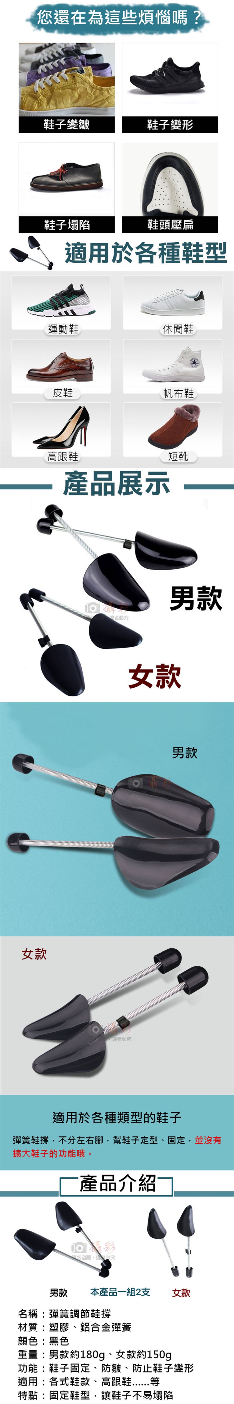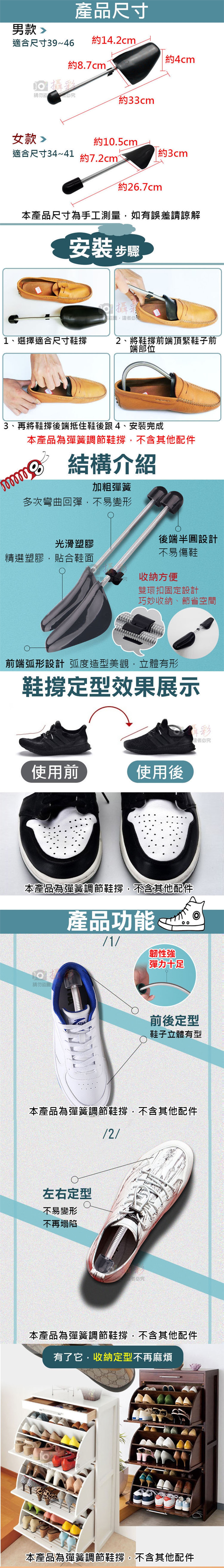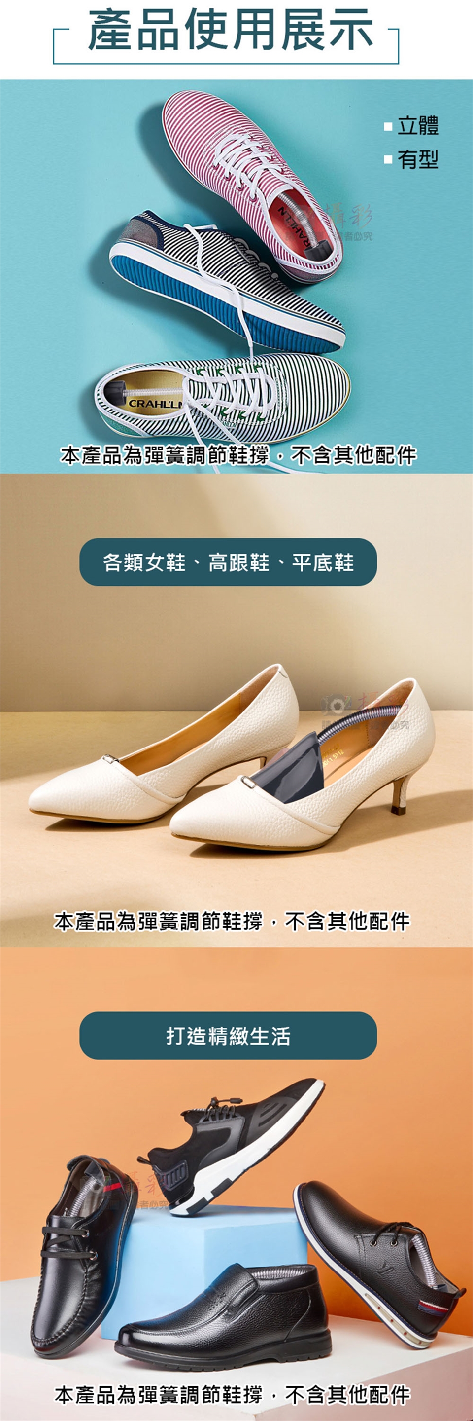 約9mm粗彈簧,不生鏽、彈性好,弧度能讓鞋撐,放置於不同大小的鞋子