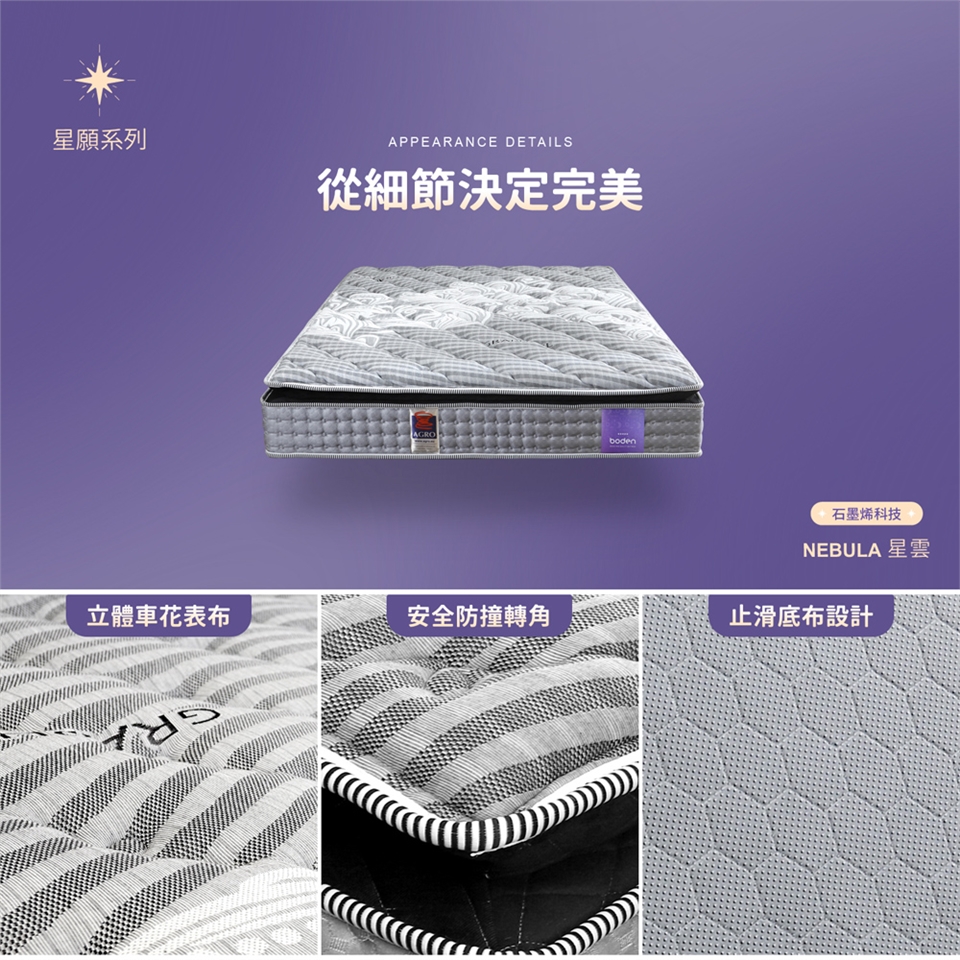 選用抗靜電石墨烯蓄熱纖維表布,吸濕排汗,恆溫透氣不悶濕,打造舒適深沉睡眠。