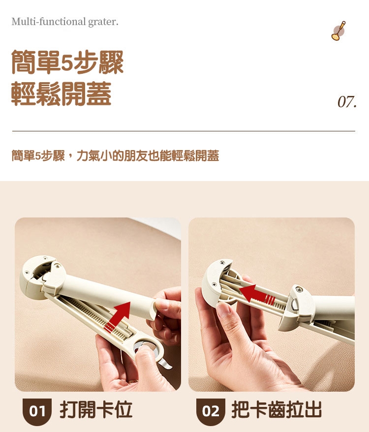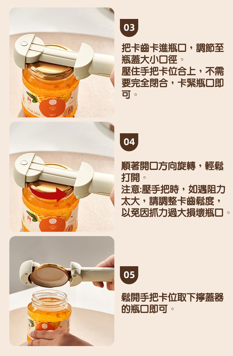 【溫馨提醒】按壓手柄時,如遇阻力太大,請調整卡齒松度,以免因抓力過大損壞瓶口!