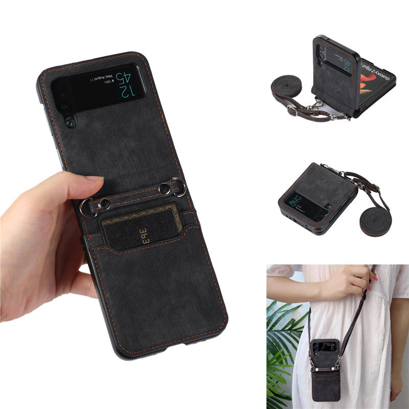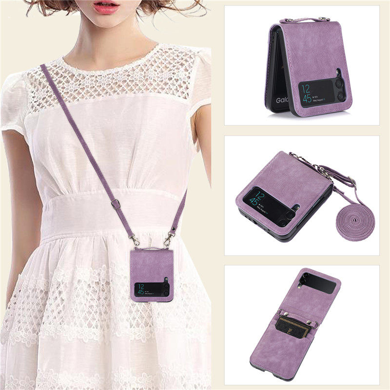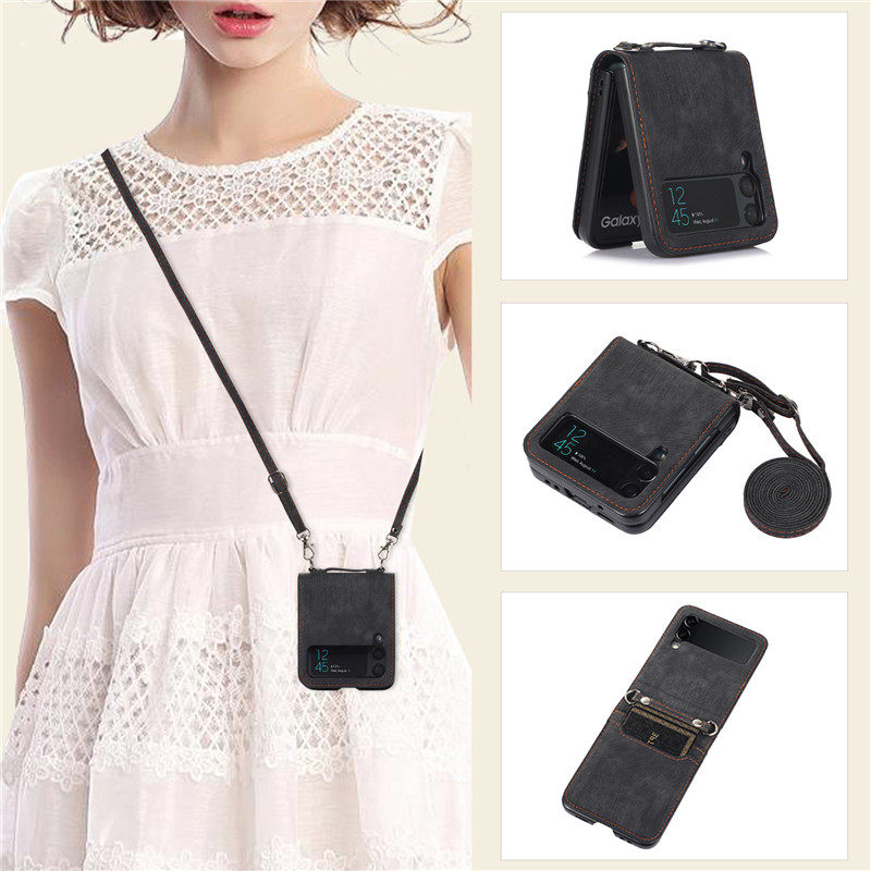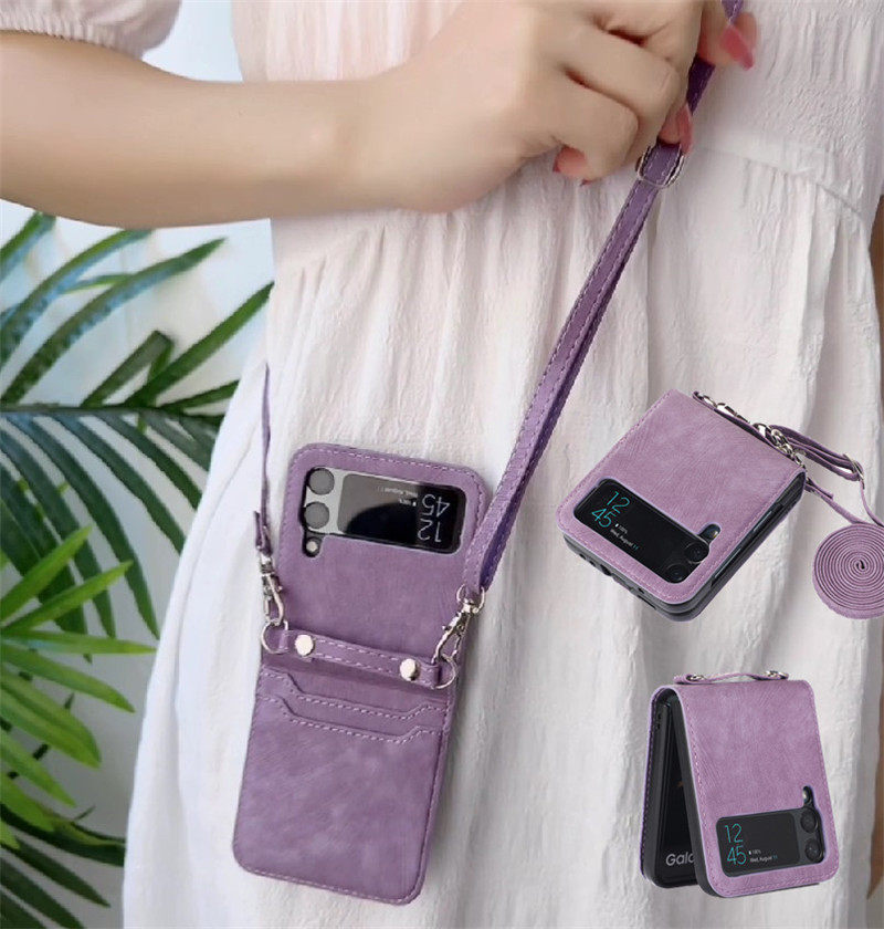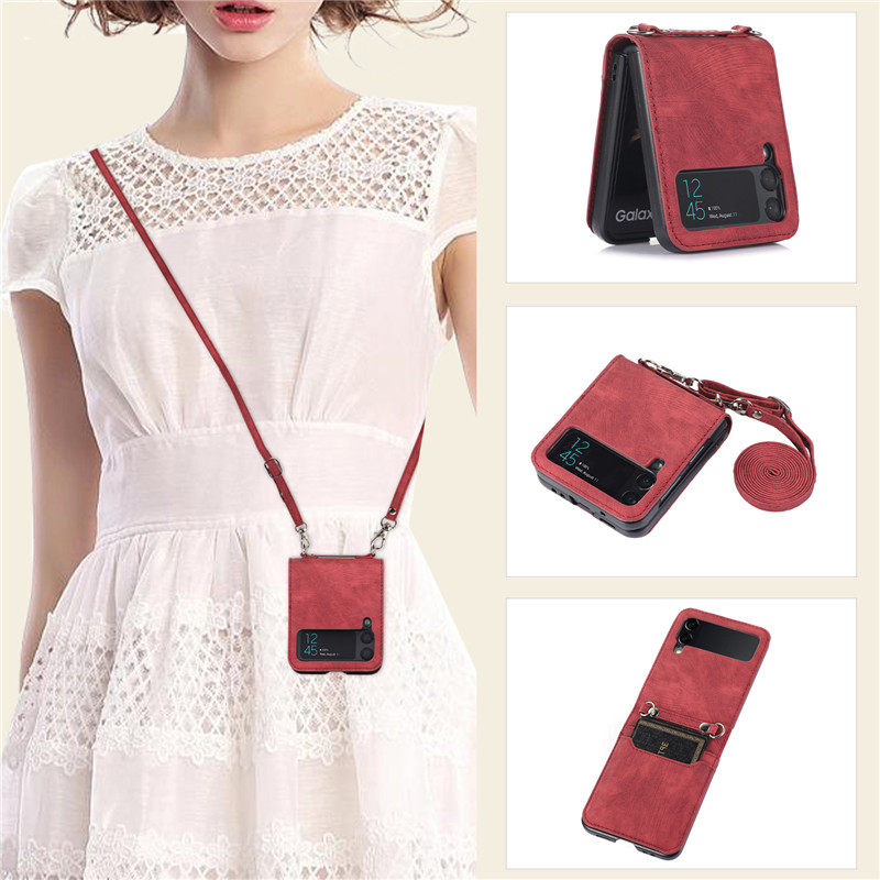 暢晟適用galaxy三星Z Flip4手機殼zflip3卡片包折疊屏手機case皮套samsung cover插卡斜挎長繩全包防摔strap