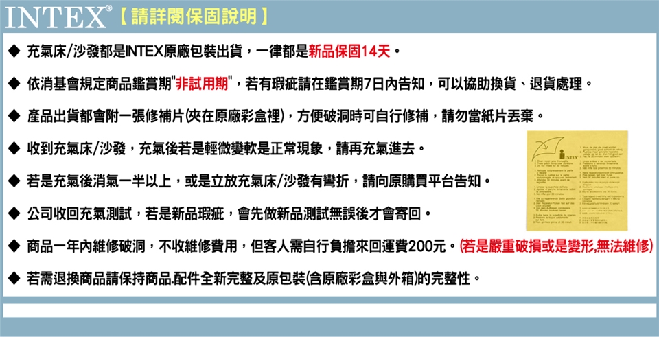 ◆ 保固:新品保固14天,商品若有瑕疵,請於鑑賞期7天內反映,一經充氣使用恕無法辦理退貨
