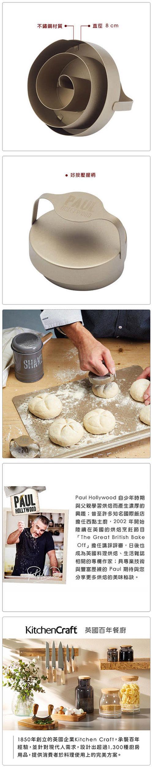 本商品一件入、適手洗清潔並保持乾燥。Paul Hollywood 系列以英國烘焙大師保羅為聯名設計,以視覺柔和的香檳色為主軸,設計出實用又安全的烘焙餐廚器具,希望擴大烤焙的範圍,讓創意無限延伸;並以自身豐富的烘焙經驗設計食譜,提供消費者美好的使用經驗。喜愛烘焙及動手作麵包的您,想讓麵包呈現更多花樣,不容錯過這款造型壓模。使用時手握壓柄將壓模器對準麵糰中心後下壓,作用類似割紋刀,便可輕鬆壓製出深刻螺旋紋路,烤出不同造型的螺旋紋麵包;適合與家中小朋友一起動手做點心,享受歡樂親子時光。也可當餅乾麵皮、黏土壓模使用,增添小朋友創作樂趣。