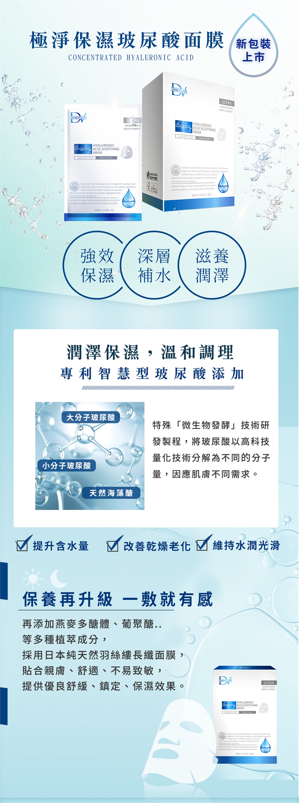清潔臉部後,將面膜打開並撕去白色珍珠膜,將面膜輕敷於臉上,靜待15~20分鐘後取下,將殘餘精華液以指腹輕推至完