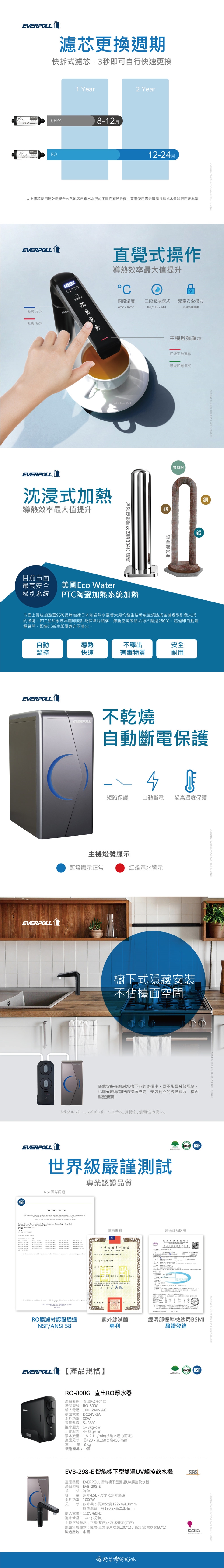 【EVERPOLL】櫥下型雙溫UV觸控飲水機+守護升級全效淨水組EVB298-E+RO-800G(EVB298E+RO800G)
