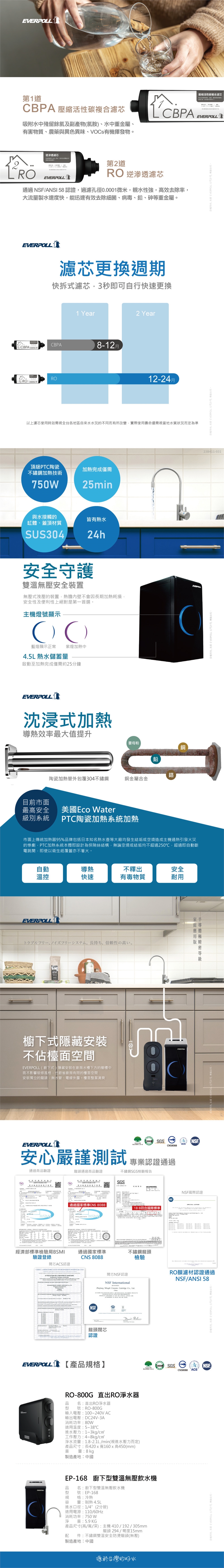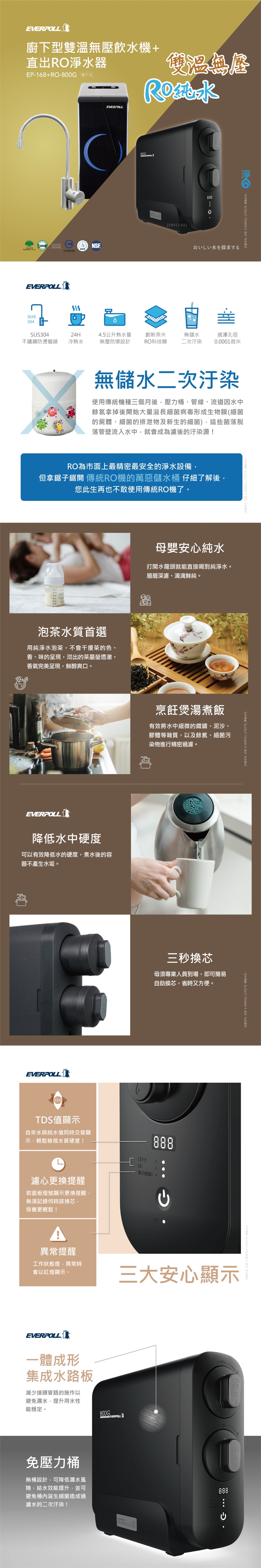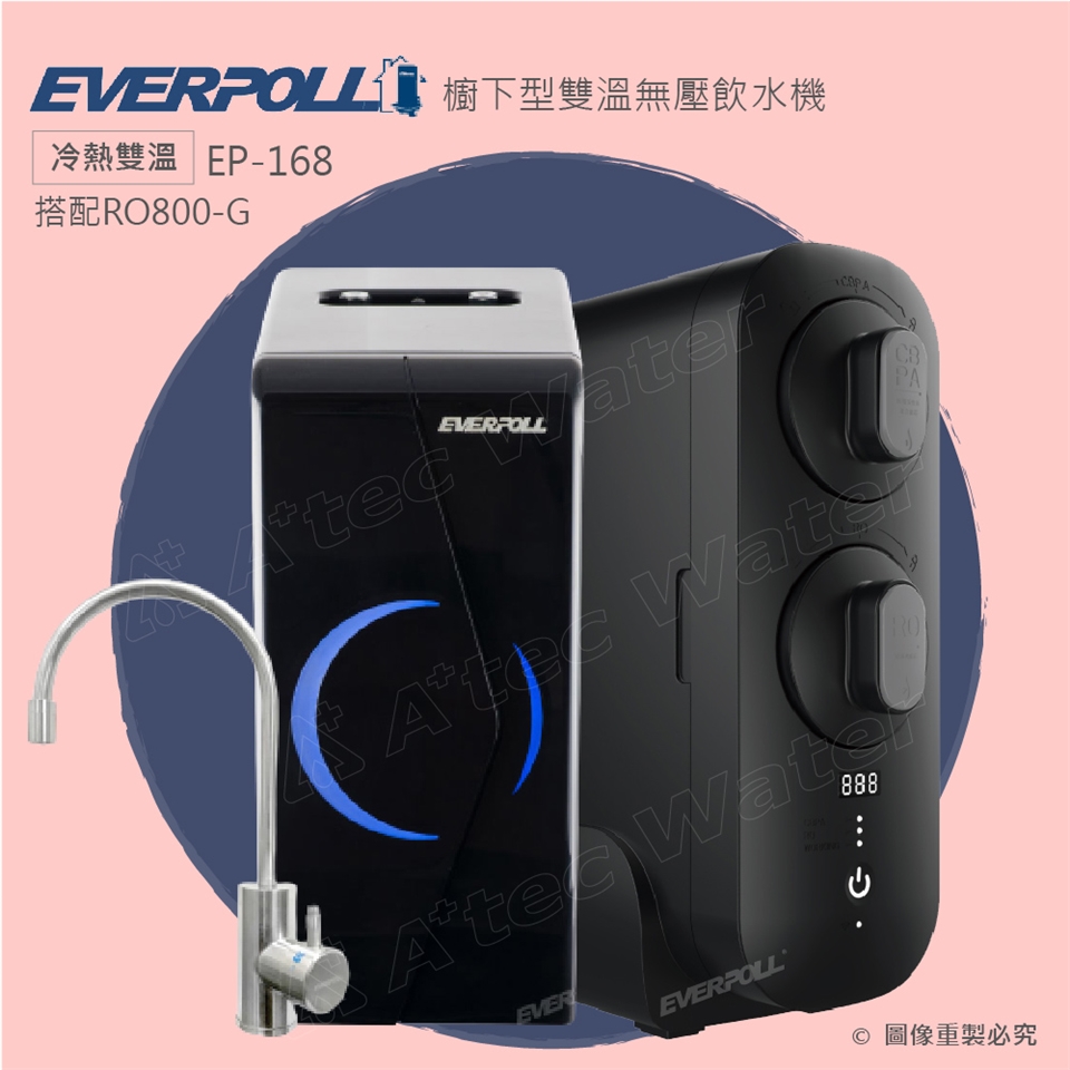 【EVERPOLL】櫥下型雙溫無壓飲水機+直出/直輸RO逆滲透純水機EP168+RO800G(EP-168+RO-800G)