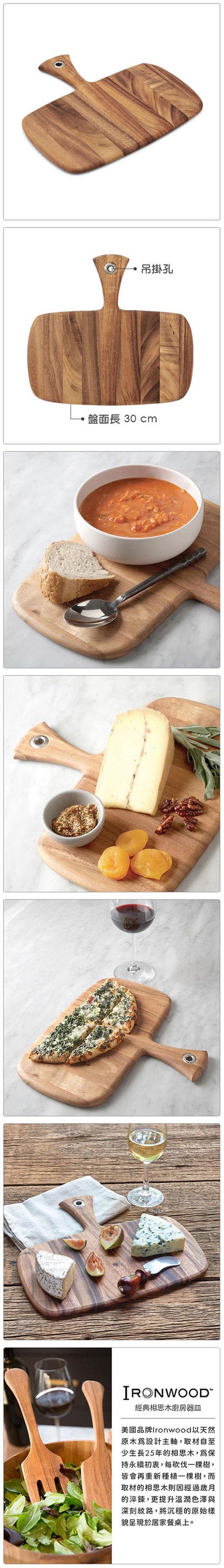 IRONWOOD 系列以天然木材為主角,將環保概念落實在餐廚配件上,深色調木質製品予人沉穩內斂的感受。聚會要端出輕食、麵包、乳酪、肉片或多樣點心時,您都可藉由此輕食盤來協助豐盛上桌。盤身以刺槐木製成,呈現溫潤自然的美感;長方型廣面搭配大握柄,盛食便利且端取不費力。出外野餐或有朋友來家裡做客,皆是盛盤上桌的好幫手。可吊掛收納省空間。