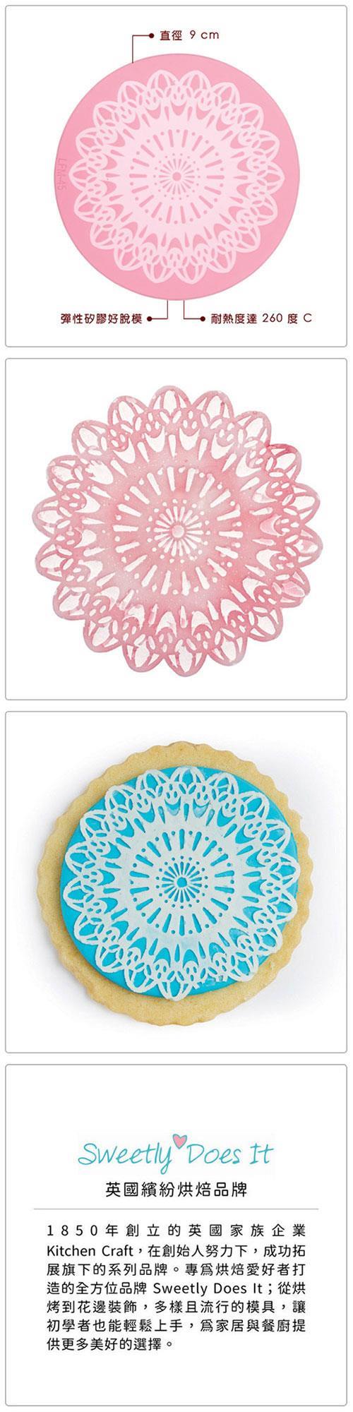 本商品一件入、耐熱度 260 度C、適用洗碗機,矽膠模具請勿使用尖銳刀叉切割。想親手製作美麗精緻的翻糖蛋糕可不簡單;利用簡單的翻糖裝飾模具,您也可以壓出細膩精緻的整片蕾絲花形紋,輕鬆變身裝飾達人。使用時只需將翻糖填入模具中,刮勻風乾後再依需求修剪、塑型即可;也可將翻糖替換成餅乾麵糰,操作簡單適合與家中小朋友一起動手做點心,享受歡樂親子時光。