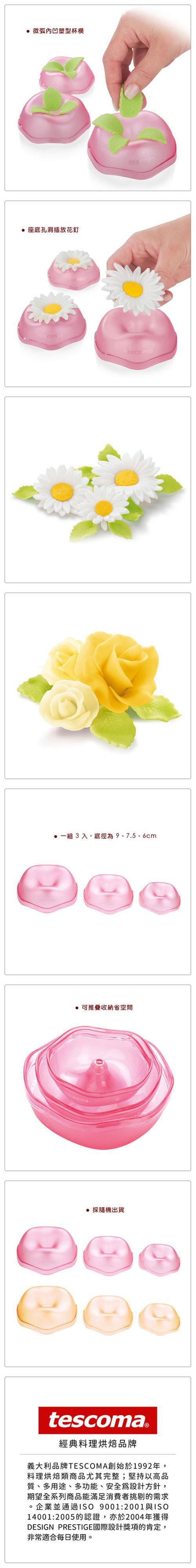本商品一組含大小杯模 x 3 (多色如圖所示,隨機出貨不挑色),適用洗碗機。想親手製作美麗精緻的翻糖蛋糕可不簡單,尤其盛開在蛋糕上的一朵朵仿真糖花,製作起來更是耗時費力;推薦您這款專為糖花塑型設計的杯模,微弧內凹杯型適合風乾定型各式花朵、花葉;座底小洞方便穿插鐵絲綁束裝飾或插放花釘,輕鬆製作玫瑰、雛菊與百合糖花,變身裝飾達人。