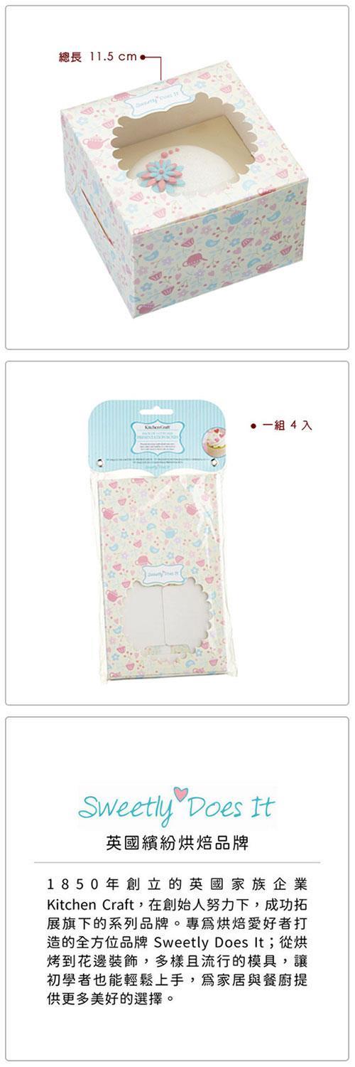 本商品一組 4 入;一次約可放瑪芬蛋糕 x 1;屬消耗品、適合蛋糕放至常溫後使用。喜愛烘焙及動手作蛋糕、餅乾親手送上祝福的您,不容錯過這款蛋糕包裝紙盒,可置放親手製作的杯子蛋糕、起司乳酪塔、布丁、果凍或是小餅乾等;盒頂透明設計可方便查看內裝物、盒內有紙卡可固定您的點心,不易滑動、碰撞而變型;搭配粉嫩而甜美的午茶花色,讓點心看起來更精緻可口,也充滿溫暖心意。