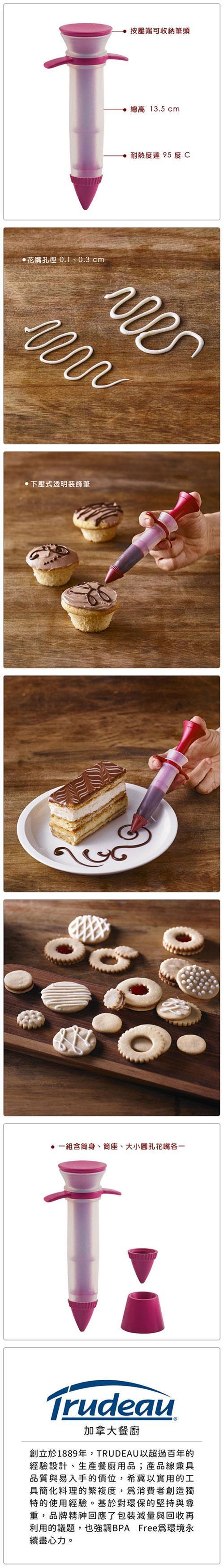 本商品一組含筒身、筒座、大小圓孔花嘴各一。法式料理中精緻的盤飾以及西點上面的裝飾,往往會有畫龍點睛的效果;運用操作簡易的擠花筒,輕鬆讓您化身為裝飾達人。透明筒身方便查看內容量多寡,筒型造型裝填便利不易擠破,可以針筒式往上抽拉填入奶油、果醬、巧克力醬(視液體濃稠度,也可由上方填入);下壓拉桿手握筒身即可在盤中或糕點上作畫裝飾或製作花式餅乾。大小兩種圓形花嘴孔,可隨使用需求自行拆裝,暫不需使用的另一筆頭可放置於按壓端收納;可畫線或點花,線條粗細由您選擇。附座方便您暫放收納,可防醬料沾到或滴到檯面,維持衛生與整潔,是您裝飾蛋糕的好幫手,也不妨讓小朋友試試看。