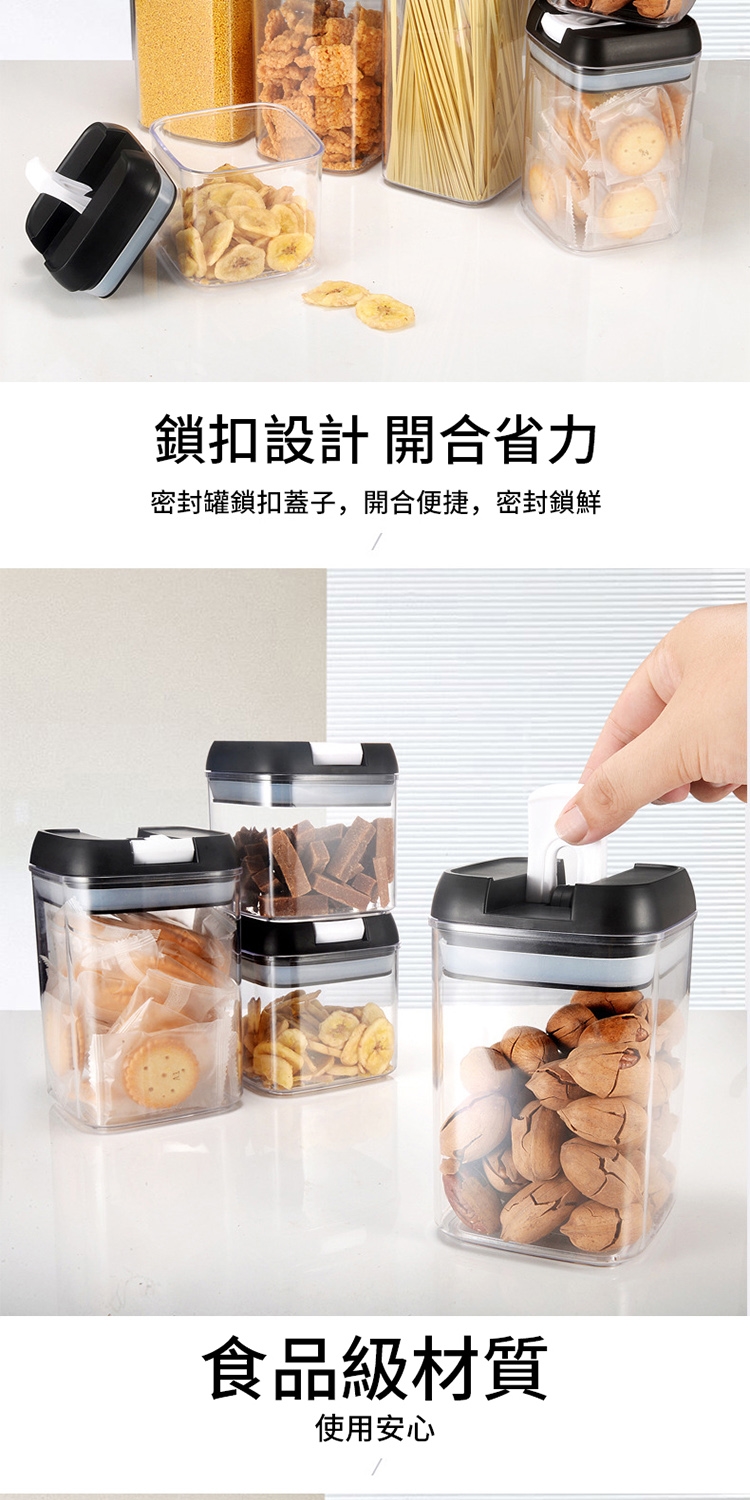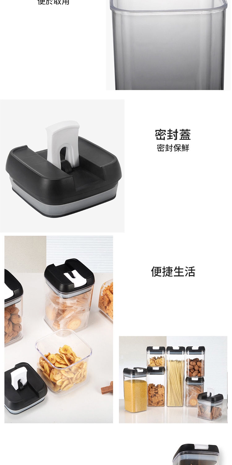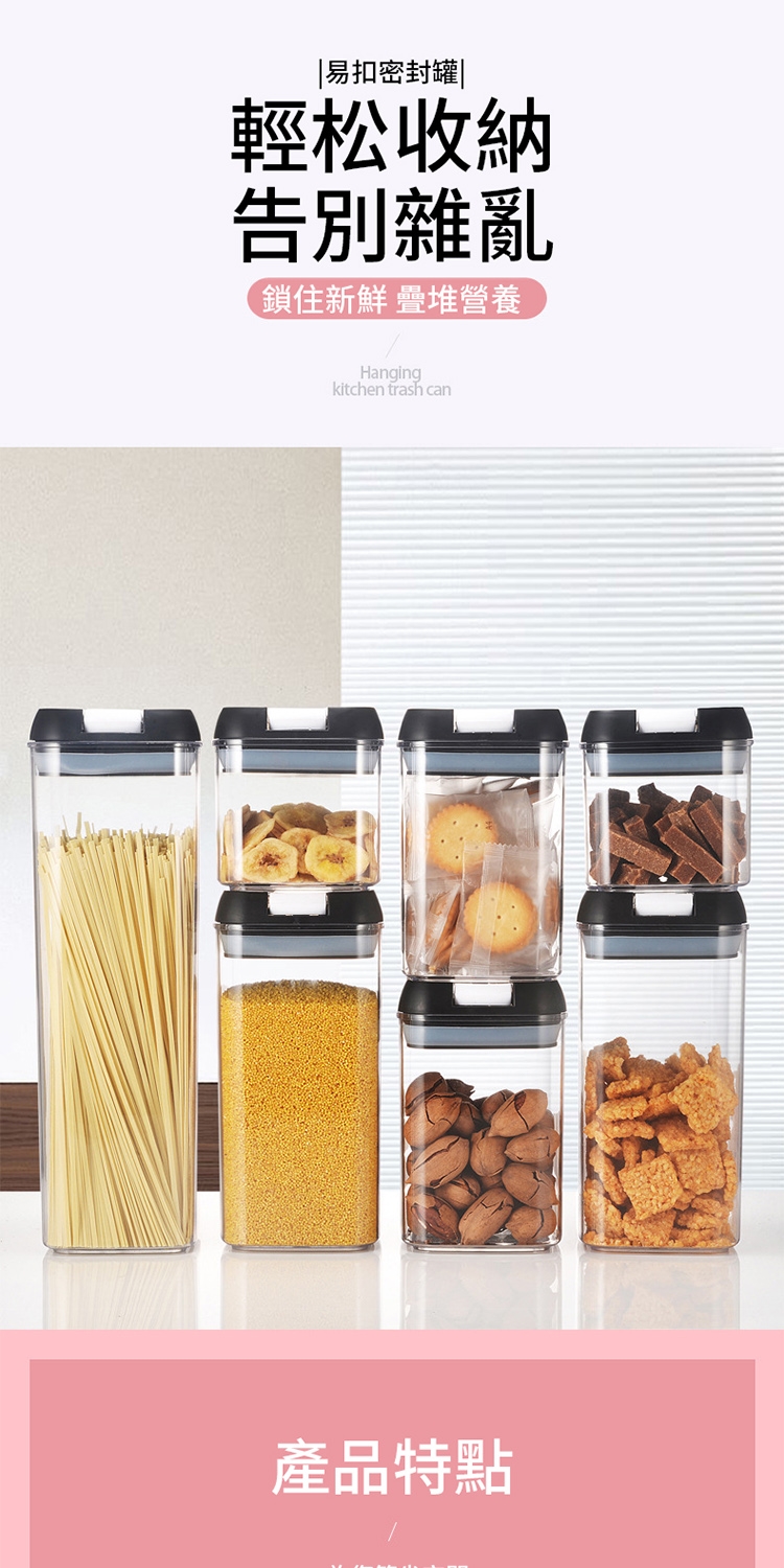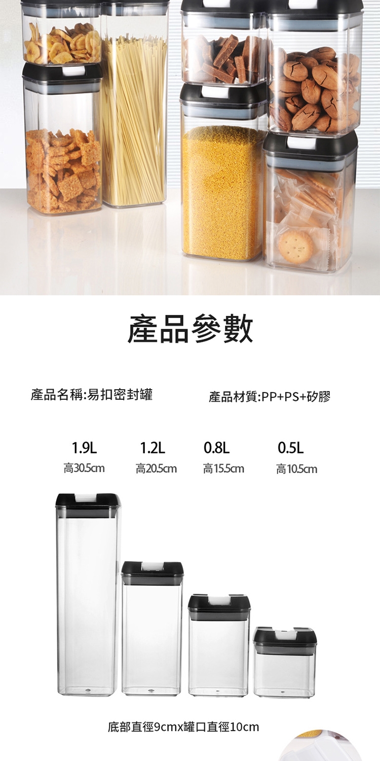 產品賣點:易扣罐適合存放各種乾貨以及各類糖果點心。易扣設計,上掀即可打開,下按即可扣緊。可隨意組合、堆疊,讓您有效的保持廚房條理性。也可放冰箱冷藏,耐熱溫度:0℃-80℃。