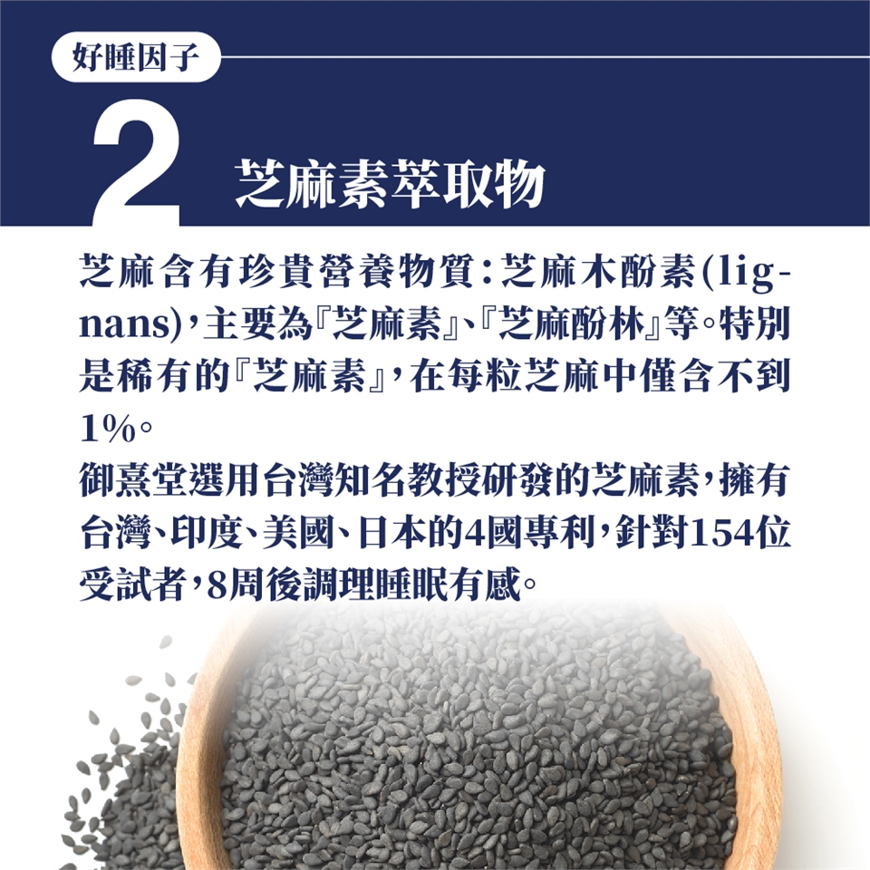 🌹:黑芝麻含有珍貴的芝麻素與芝麻酚林,每1公斤黑芝麻只能萃取出0.005公斤的芝麻素。御熹堂選用台灣知名教授所研發的芝麻素,擁有國際4國專利,能幫助入睡,維持好氣色。