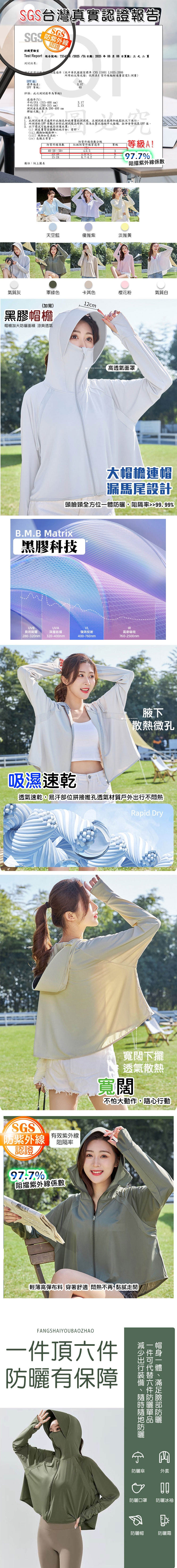告別烈日灼燒,迎接涼感出行!本款防曬外套通過 UPF44 測試,有效阻擋 97.7% 紫外線,讓你無懼 UVA/UVB 傷害,輕鬆防曬一整天。