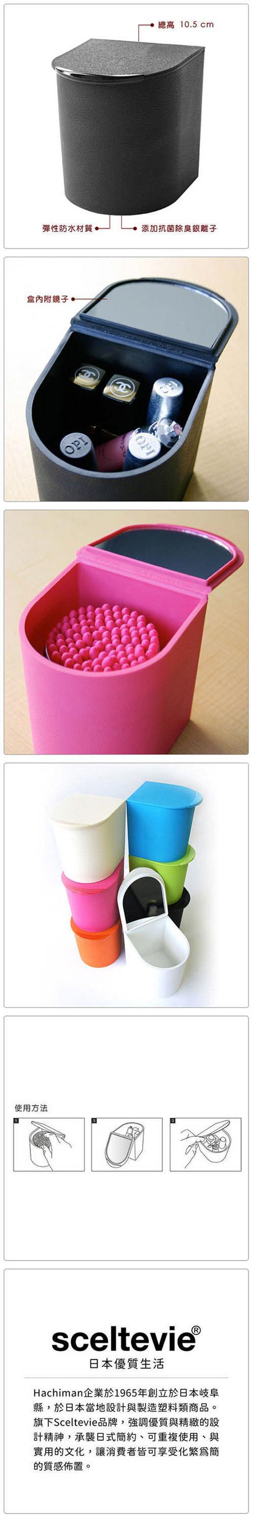 本商品一件入、添加抗菌除臭銀離子。防水的塑料材質,方便收納於高溫潮濕的浴室、廚房等空間。化妝台或潮濕的衛浴空間,您需要收納乾淨的棉花棒、化妝棉或其他女性用品,此時除了收納外、更重要的便是抗菌除臭的功能了。盒蓋內附鏡子,讓您梳妝打扮也實用方便。彈性佳的外盒,也可減少使用時刮傷桌面或壁面的機會。