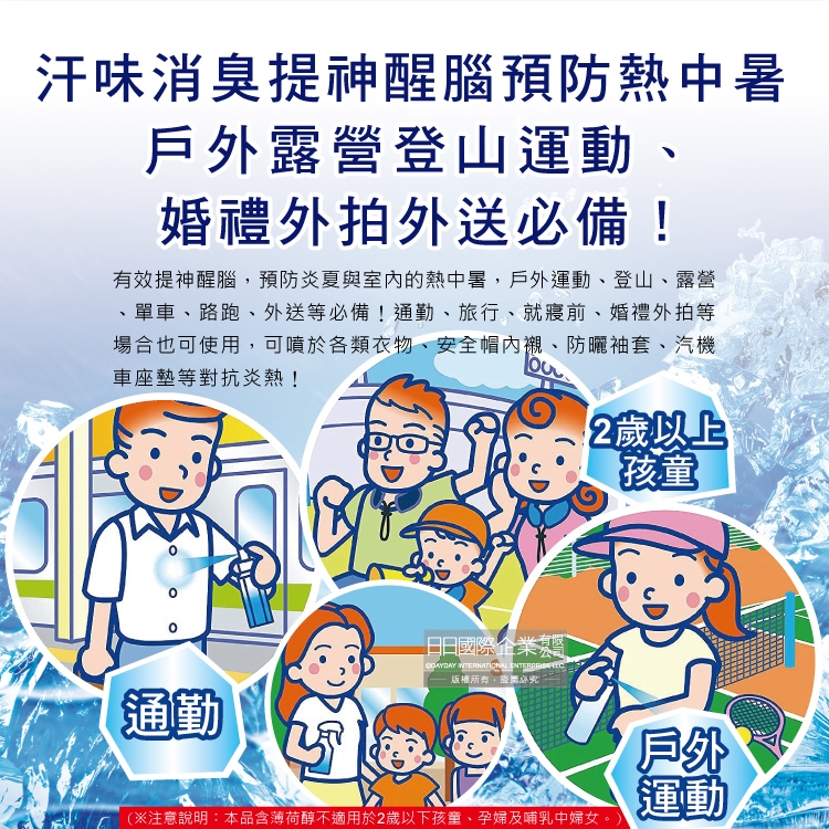 ●用途:噴灑後使衣物冷卻降溫消臭,使身體保持涼爽舒適。