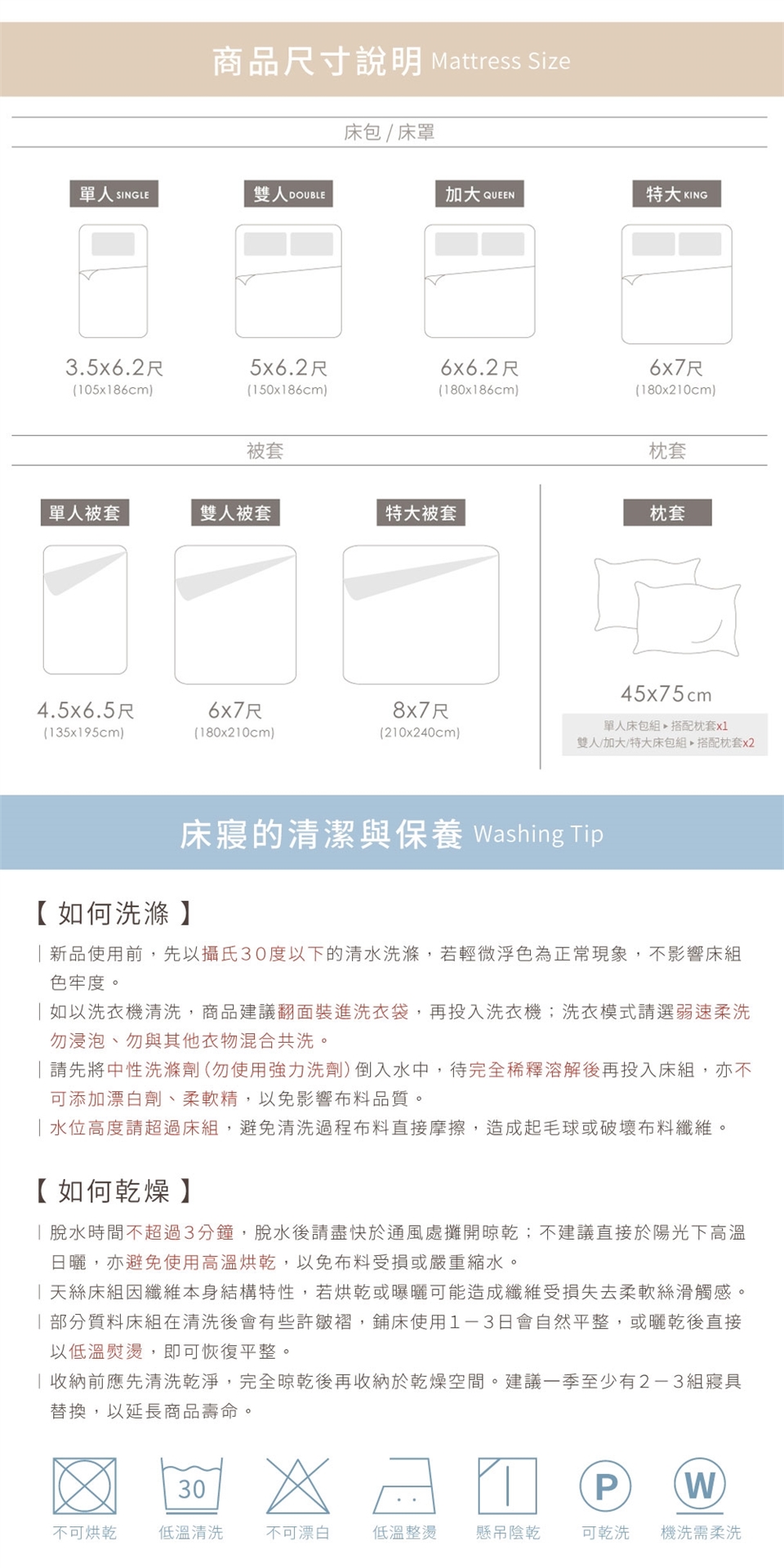 不可漂白、乾洗,並定期日曬達到消毒除溼效果