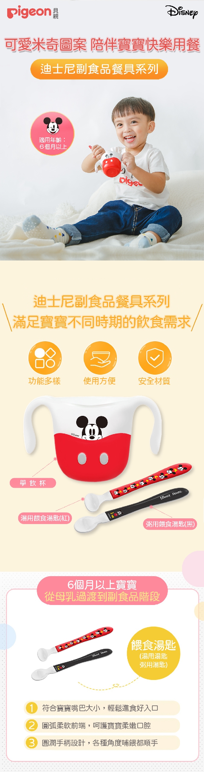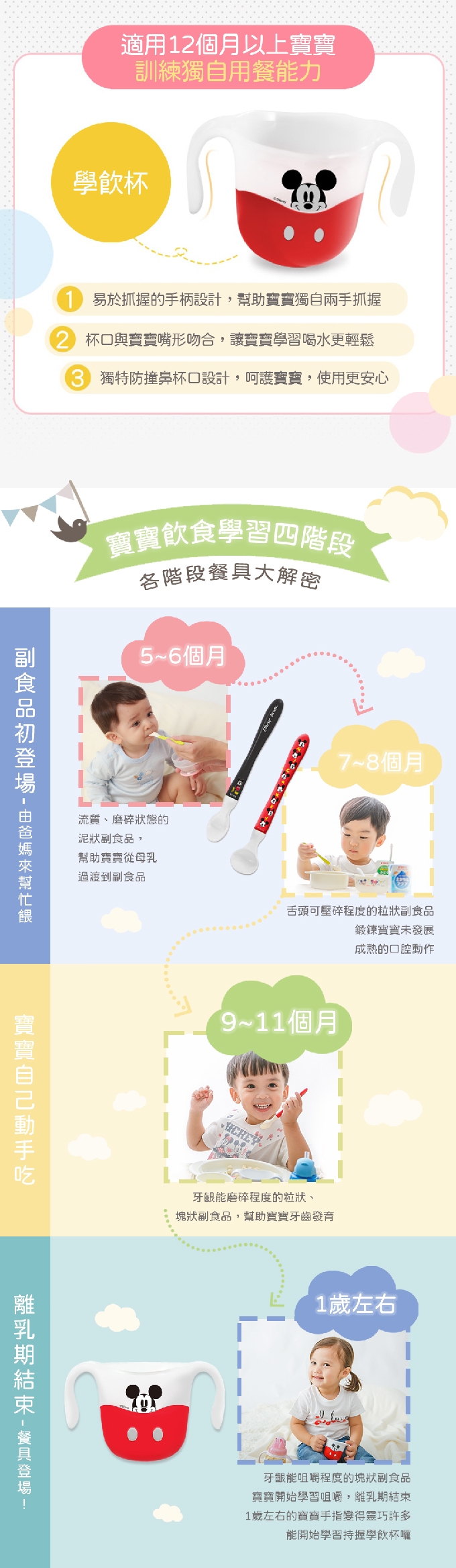 - 配合寶寶的口部發育,以嬰兒一口適量的大小,透過餵食過程,讓寶寶自然學會「吃與喝」。