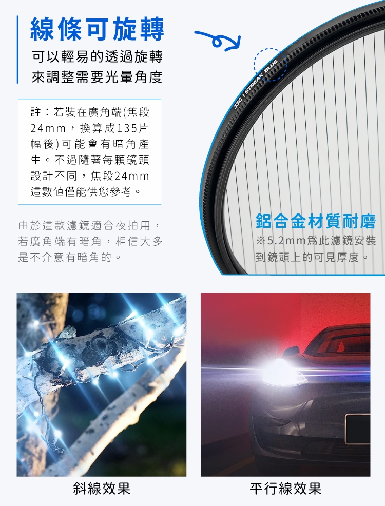 註:若裝在廣角端(焦段24mm,換算成135片幅後)可能會有暗角產生,不過隨著每顆鏡頭設計不同,焦段24mm這數值僅能供您參考;不過,由於這款濾鏡本身就是適合夜晚拍攝,就算廣角端有暗角,相信大部分時候是不介意有暗角的。
