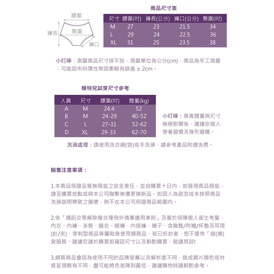 1.依「通訊交易解除權合理例外情事適用準則」及基於保障個人衛生考量,內衣、內褲、泳裝、睡衣、睡褲、內搭褲、襪子、含胸墊/附襯/杯墊及耳環(針/夾)、穿刺型商品等屬貼身使用類商品,若已拆封者,恕不提供「退(換)貨服務。建議您請於購買前確認尺寸以及斟酌購買,敬請見諒!
