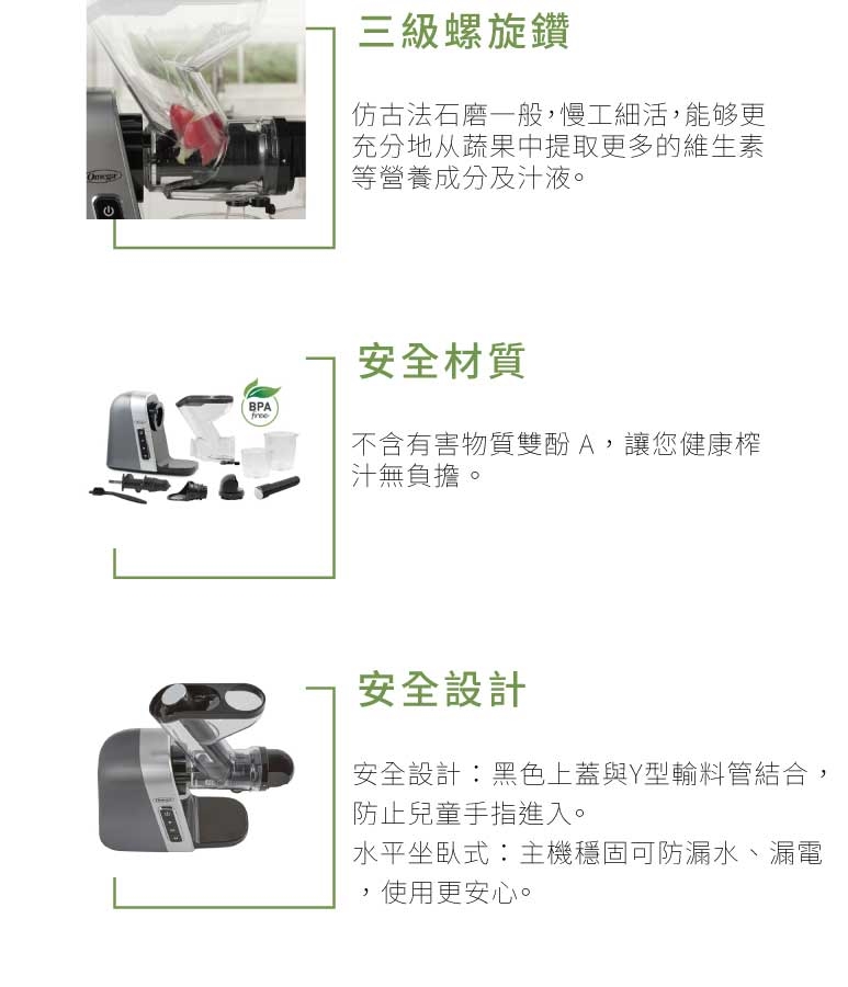 透過三級螺旋鑽的研磨,可自蔬果中獲得更多的維生素等營養成分及汁液。