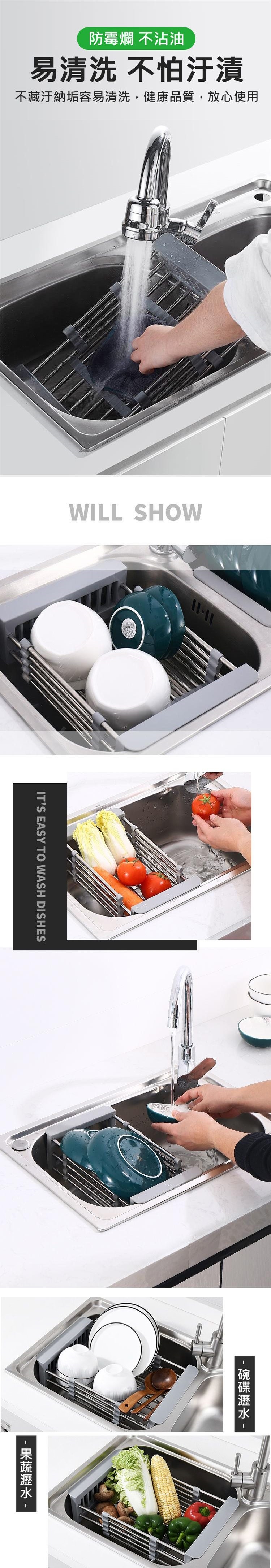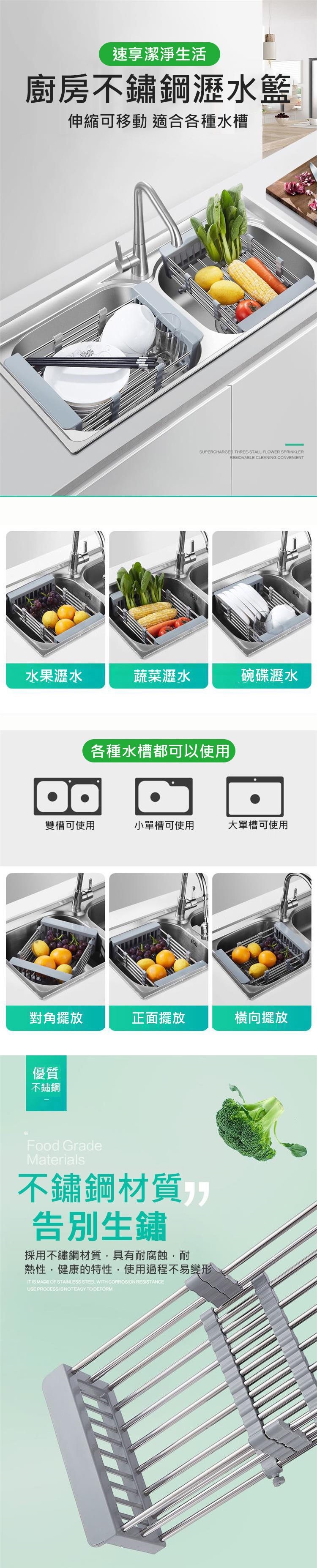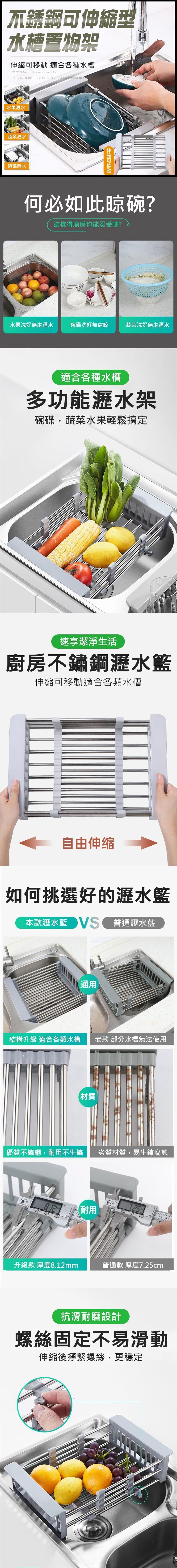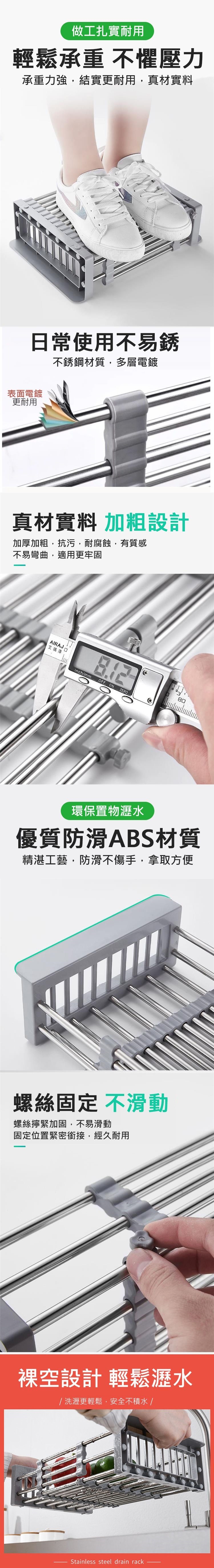 不鏽鋼材質,耐磨耐腐,多層電鍍更耐用,適合廚房環境,加粗設計穩固牢靠,不易彎曲,承重力佳,ABS包邊,滑動不傷水槽,可自由伸縮,擺放角度不受限,螺絲固定,穩固不滑動,多功能用途,瀝水、備料、碗盤瀝水等
