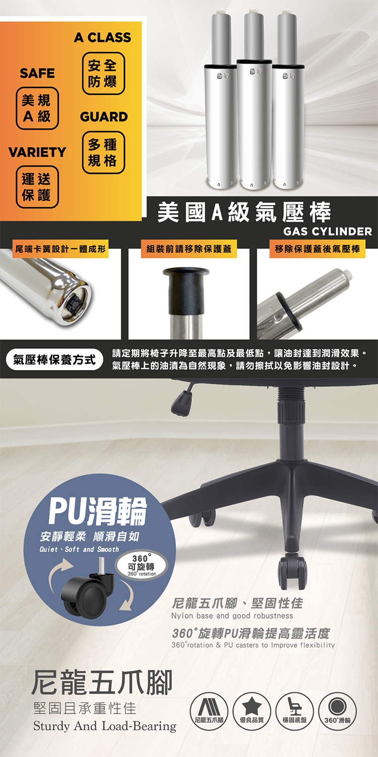 材質:網布 + 塑膠射出 + 尼龍五爪腳 + PU輪
