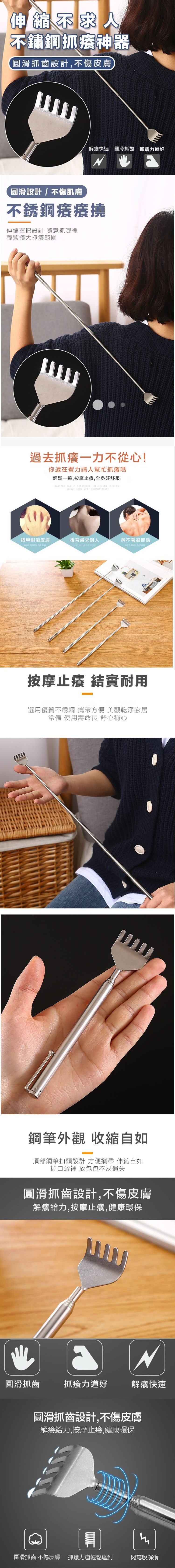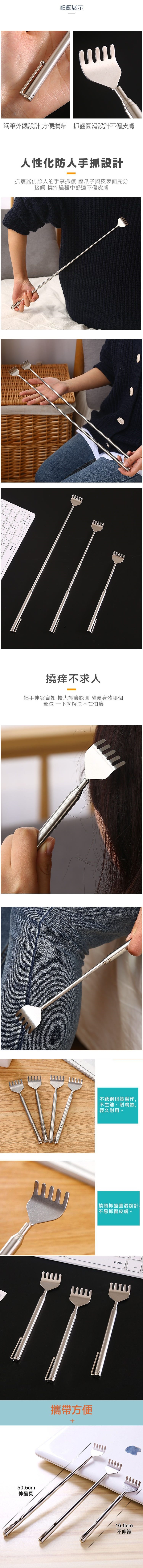 優質不鏽鋼不易生鏽,小手般的五爪外型,跟皮膚表面充分接觸,輕鬆解決後背癢抓不到,鋼筆造型大小好攜帶,伸縮趕連接處緊固抓癢不回縮,圓滑爪齒,抓癢力道好,不易抓傷皮膚,伸縮自如,輕鬆抓癢不求人