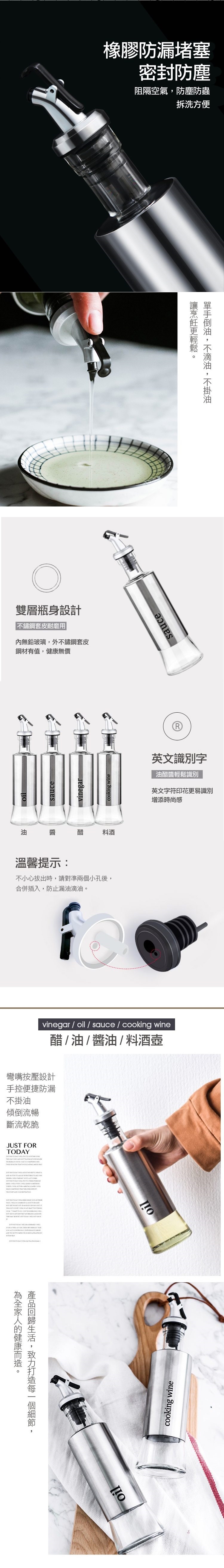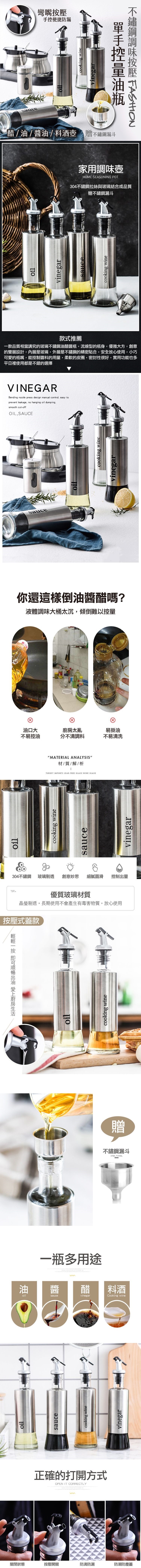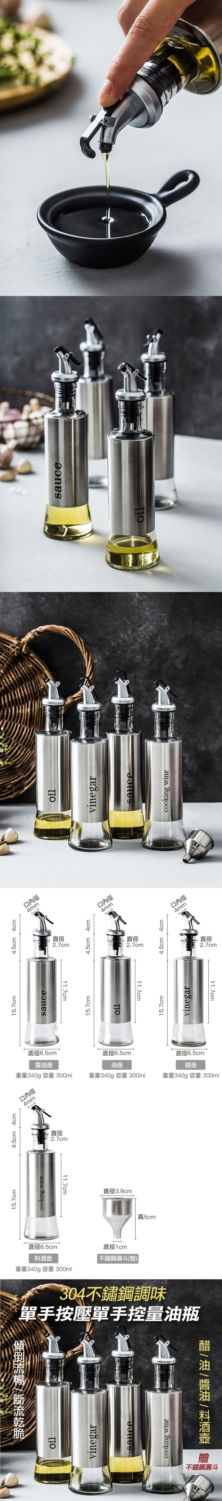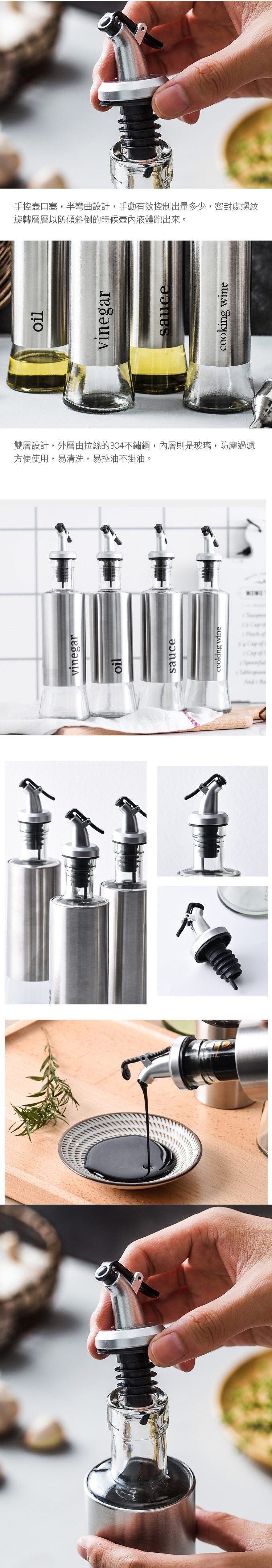 採用不鏽鋼與無鉛玻璃,質感更提升,可單手操作,輕鬆控量,不怕失手毀了美味料理,瓶身英文識別字符,瓶底透明設計,可清楚辨識,可拆式油嘴,密封矽膠圈,密封性好,避免內容物變質,換氣孔設計 出油順暢,贈不鏽鋼漏斗,填裝醬料更方便