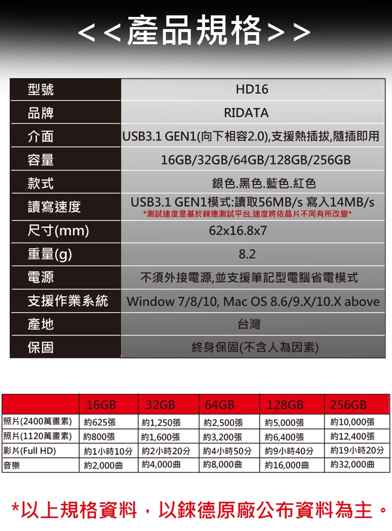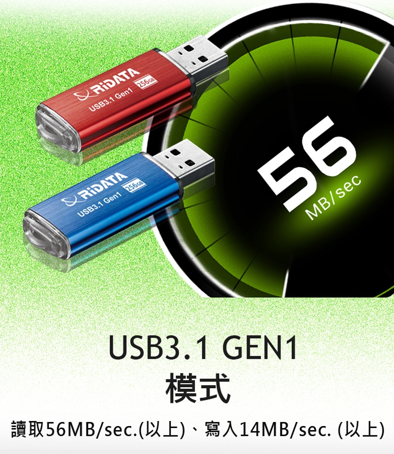 ● 讀寫速度(USB 3.1 GEN1 模式):Read up to 56MB/sec、Write up to 14 MB/sec