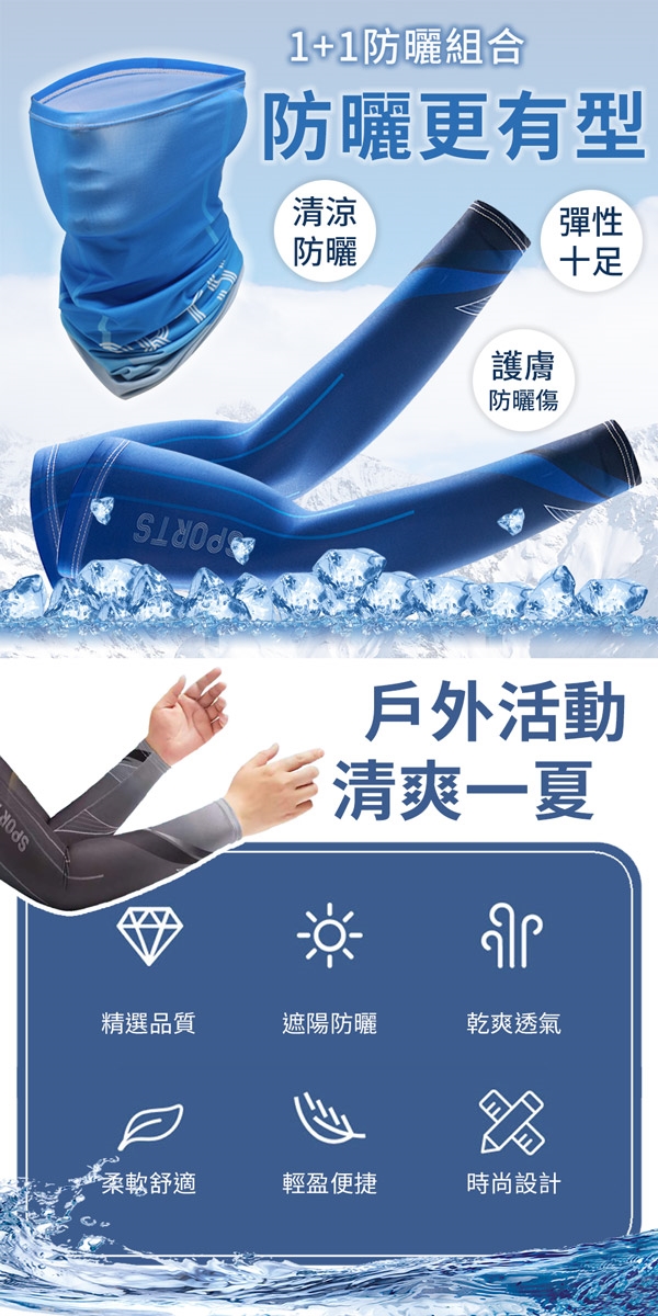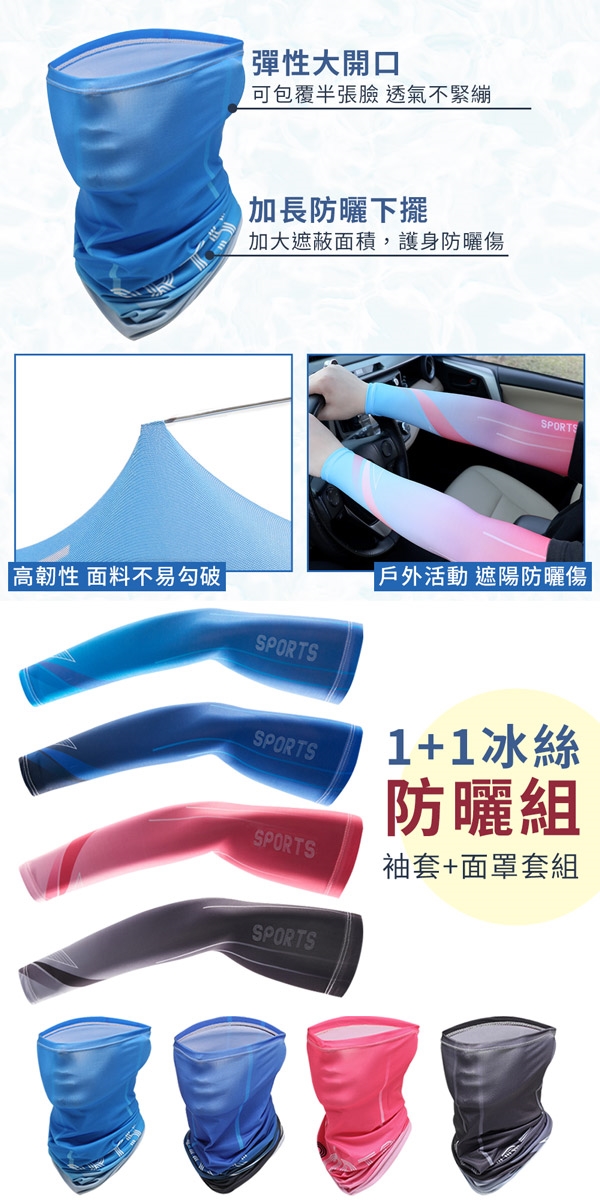 冰絲防曬防風袖套頭套組,冰絲材質,觸感涼爽舒適,高彈力拉伸不變形,活動靈活自如,配色豐富,袖套加頭套,防曬防風,保護臉頸部和手臂,避免陽光直曬。適用於通勤、運動等