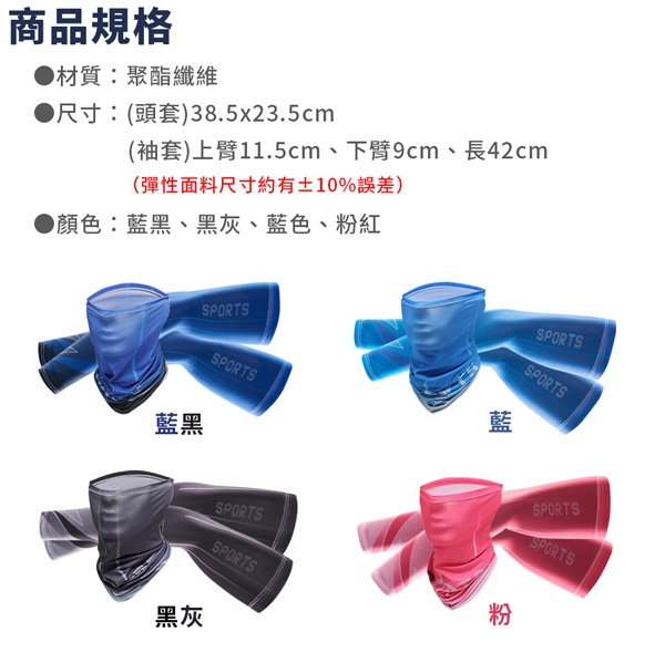 ●尺寸:(頭套)38.5x23.5cm、(袖套)上臂11.5cm、下臂9cm、長42cm