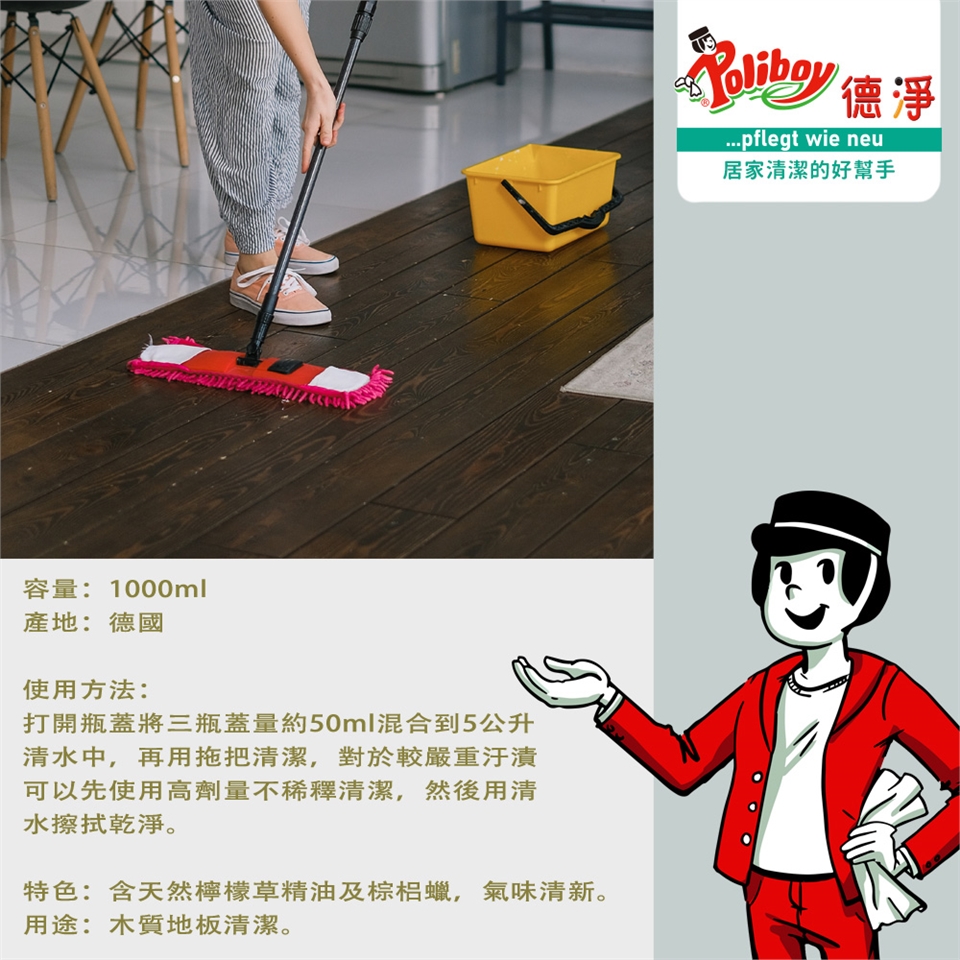 打開瓶蓋將三瓶蓋量約50ml混和到5公升清水中,再用拖把清潔,