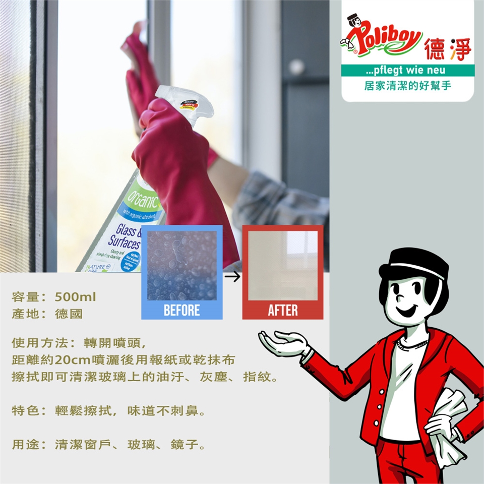 【使用方法】轉開噴頭,距離約20cm噴灑後用報紙或乾抹布擦拭即可清潔玻璃上的油汙、灰塵、指紋。