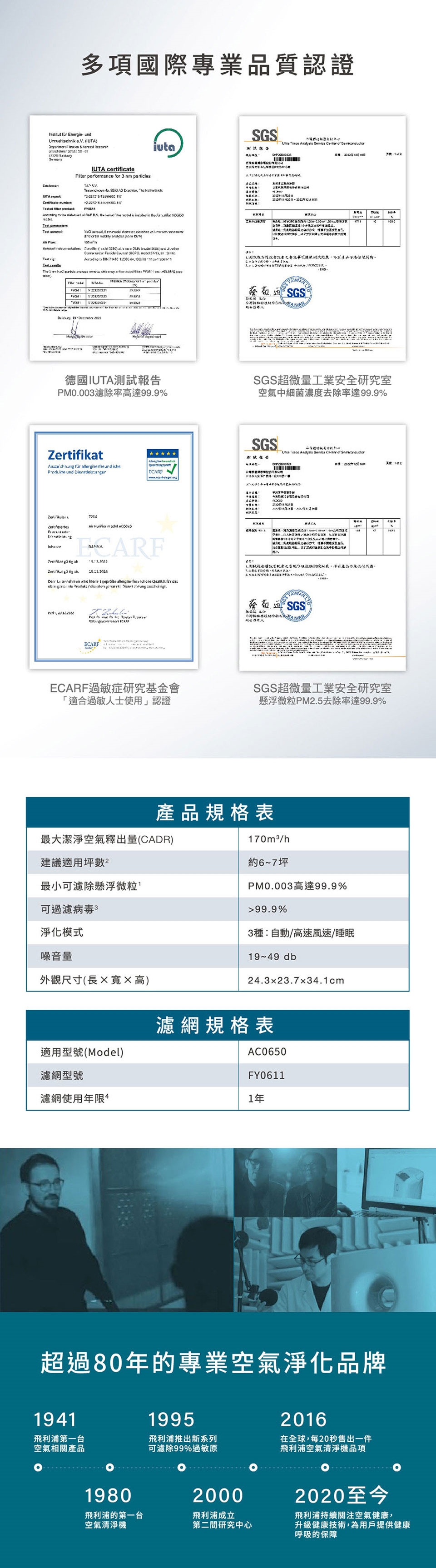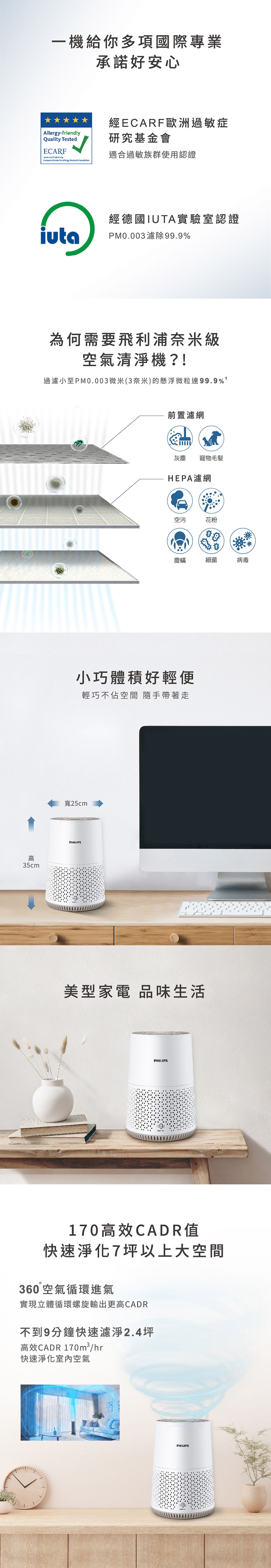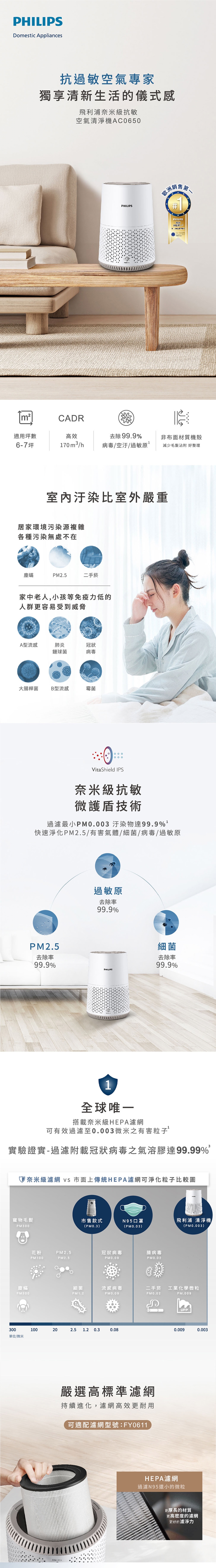 AC0650採用獨特360度進氣設計,提供室內0死角的全面淨化。搭配濾網配件為奈米級濾網(FY0611),