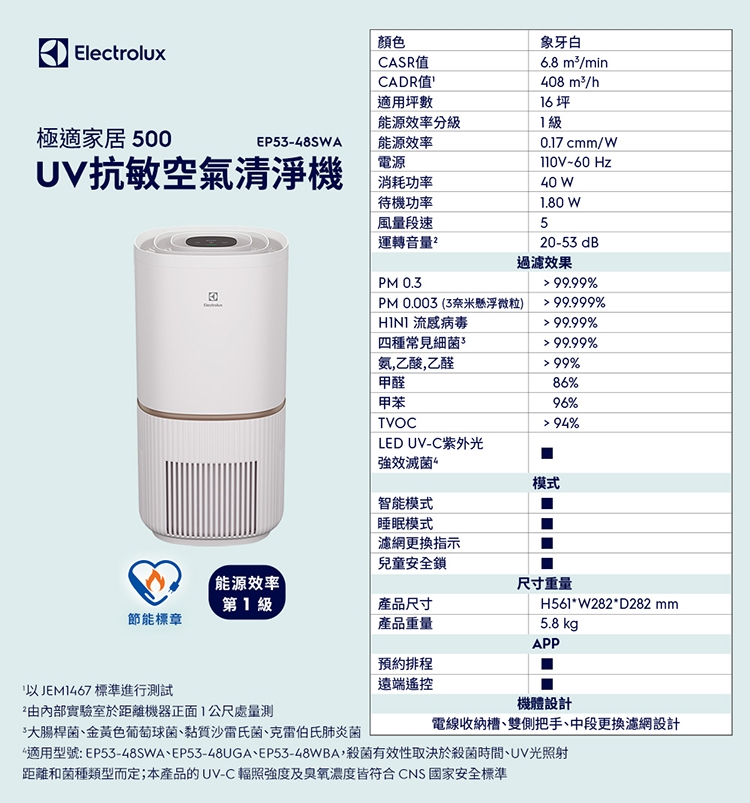 Electrolux伊萊克斯 ~16坪 UV抗敏空氣清淨機-象牙白 EP53-48SWA