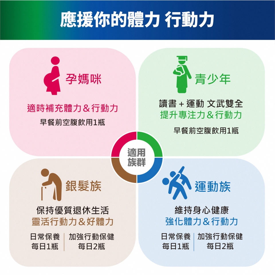每天1份,欲加強行動保健者每日攝取2瓶。