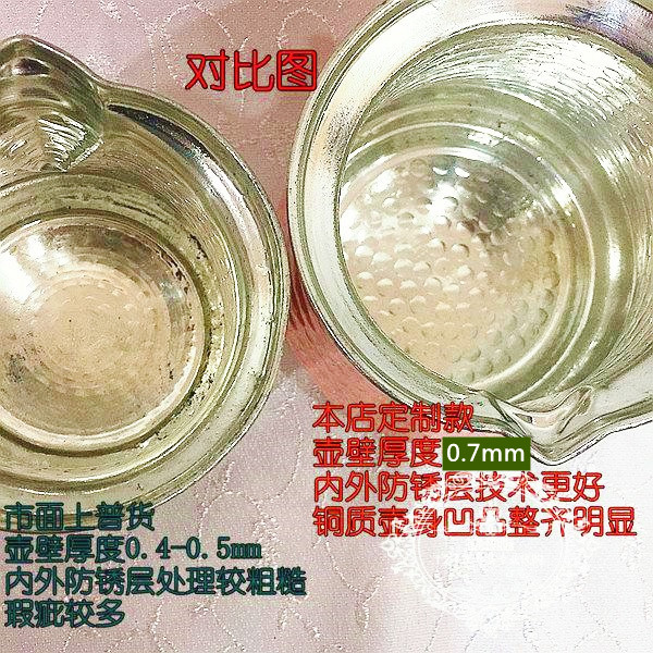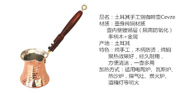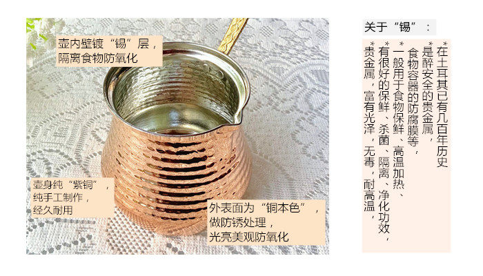 小店所有的咖啡壺、酸奶壺等手工壺均為紫銅材質的壺身,經久耐用;內壁鍍錫層,起到隔離防氧化的作用;