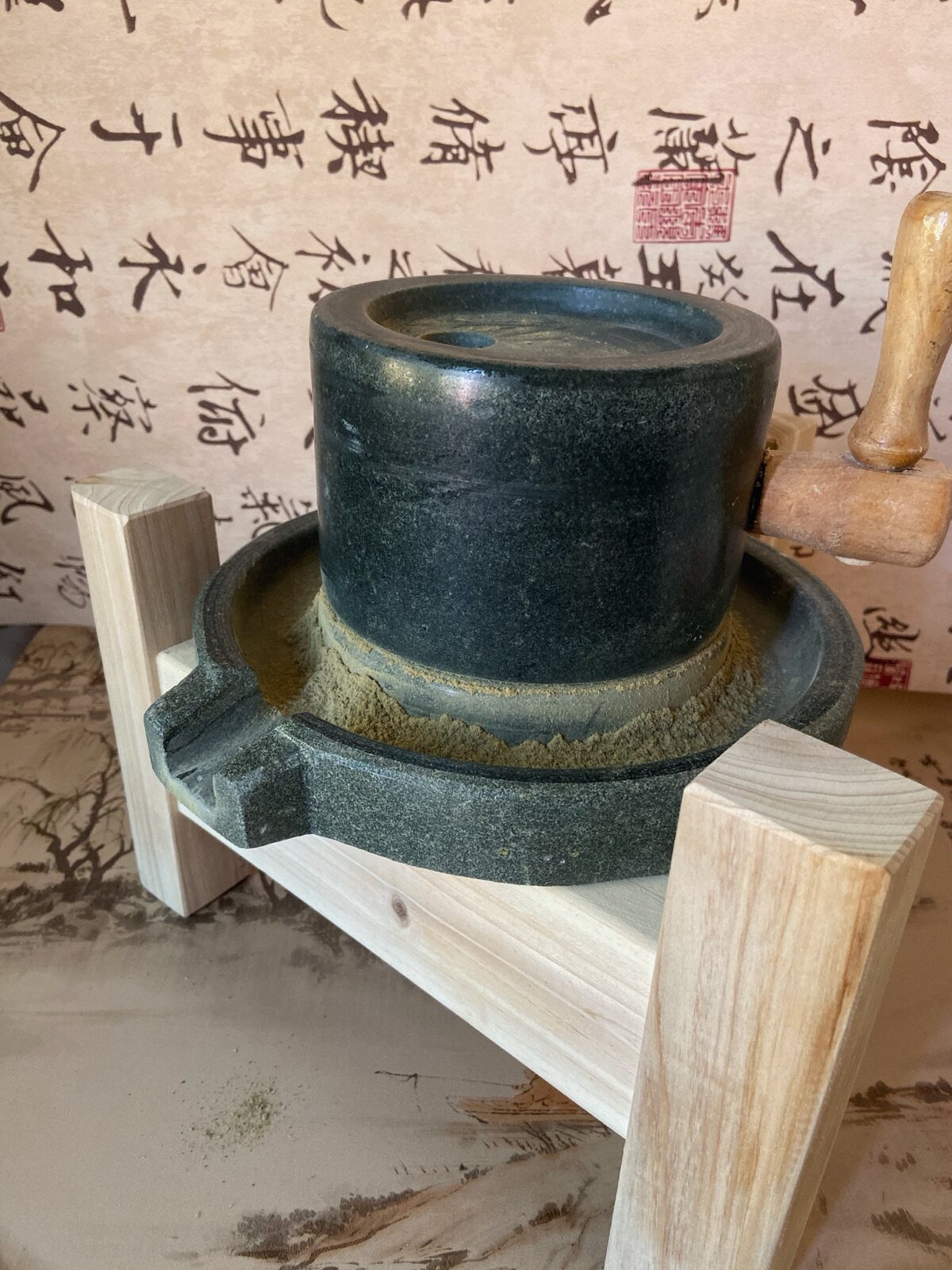適合初學者級別的石磨,可以輕松的研磨出150目左右的茶粉,建議搭配粉篩一起使用。