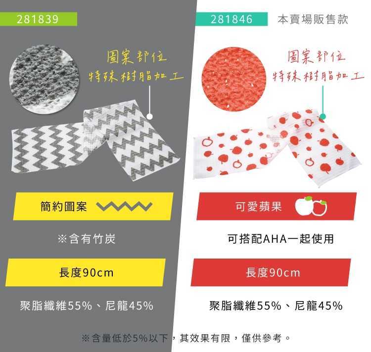 ●雙重去角質的拍檔,帶有偏硬觸感的布料和加上特殊樹脂加工,清潔更有力。