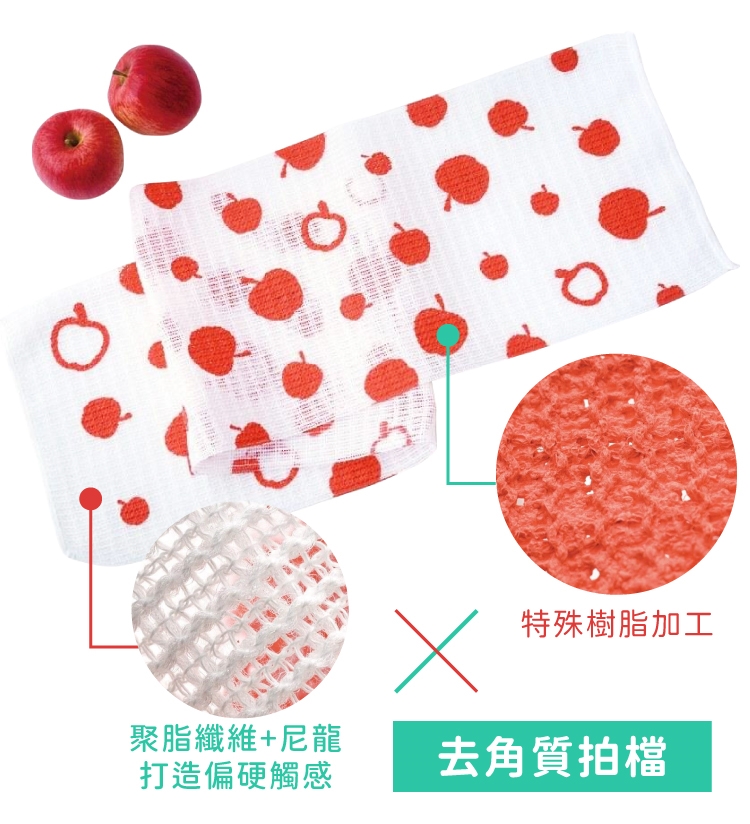 ●長度有90cm,全身皆適用,亦適合拿來洗背,因蘋果圖案的部分有樹脂加工,能夠帶走肌膚上的髒污。