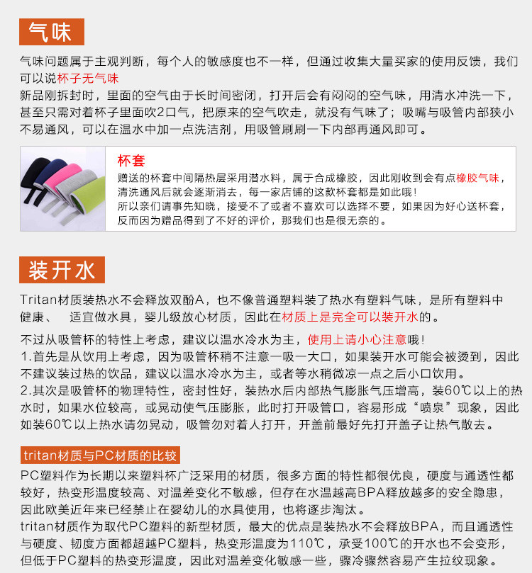 溫馨提醒:杯子采用美國進口TRITAN材質,不含BPA,沒有異味的 耐溫度零下-10度至+96℃(剛燒開的水是100℃),不過tritan材質的熱變形溫度為96℃,低于PC塑料,因此對溫度變化敏感一些,驟冷驟冷瞬間溫差較大時容易產生拉紋現象,但不影響使用,因此建議裝飲水機里面的開水或剛燒滾的開水等1-2分鐘左右再倒入杯子里哦!切記不可直接裝剛燒滾的開水,或者放入沸水中蒸煮/放消毒柜中高溫消毒,不然會導致杯子變形,人為使用不當造成杯子變形我們不負任何責任!介意別買,謝謝!