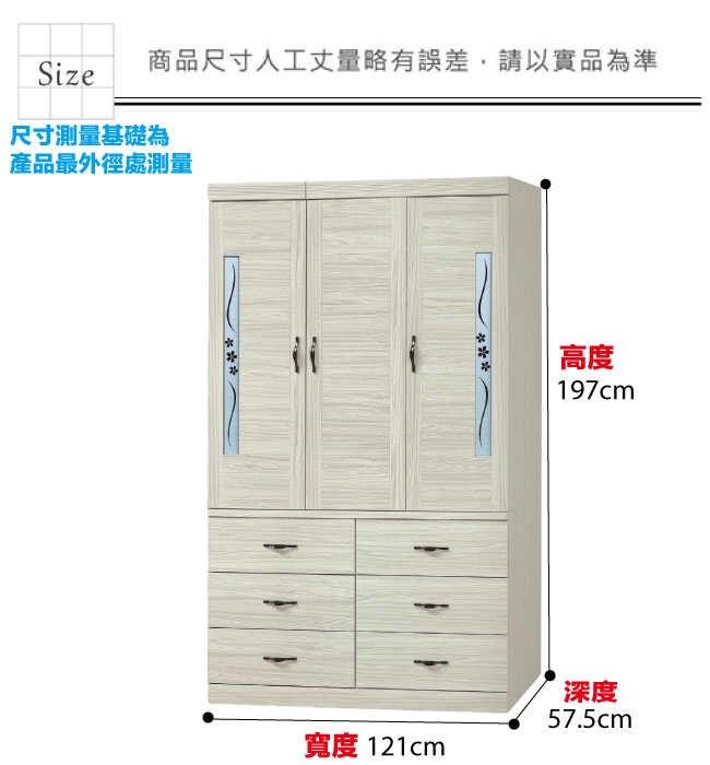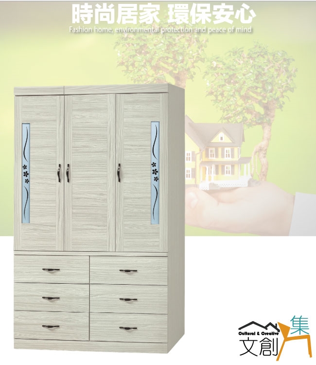 【文創集】納米4尺三門六抽衣櫃 淺橡木紋色系+現代簡約風格+安心材質製造,整體採用防蛀木心板+防潮耐磨底座+五金滑軌結構+防夾手緩衝門片五金等安心材質製造,產品外層採用防潮耐磨噴漆處理搭配採用開門櫃+六抽屜+吊衣桿+內開放層格等收納空間設計,全由專人配送到家,專業安心服務,替你省下更多時間!