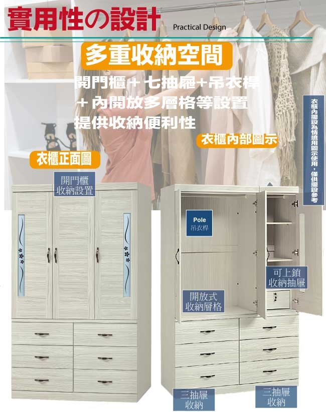 搭配採用開門櫃+六抽屜+吊衣桿+內開放層格等收納空間設計