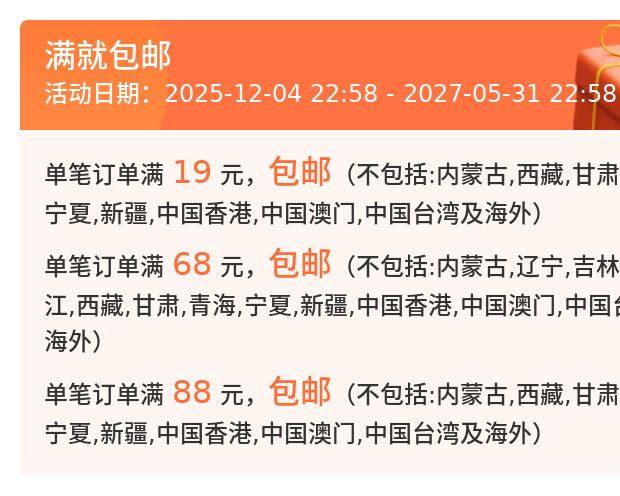 訂單達到免運條件後,運費將涵蓋關稅及5公斤以內包裹的基本運費。若包裹最終稱重超過5公斤,超重部分將依據集運倉運費計算公告(https://m.bcatlogistics.com/single?id=115)依照材積重量加收運費。客服人員將在收到加收運費通知後與您聯繫。若於收到收費通知D+5日內無法聯繫上您或未得到回覆,訂單將直接取消,包裹將進行逆物流退回廠商。此外,消費者需承擔大陸端的往返運費(約新台幣200至2000元不等)。若未支付逆物流費用,將無法進行退款作業。建議您在下單前先與商家客服確認運費預估金額。 - 「全球購折價券及運費折抵券,為消費者免費領取,視為附條件使用的優惠券,僅限訂單成功完成後生效。若因斷貨、缺貨等不可控因素導致訂單取消,折價券/運費折抵券因交易未成立而失效,恕不返還。消費者領取及使用本折價券,即視為同意相關活動規則及限制。」
