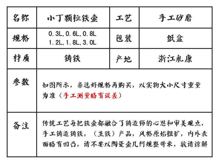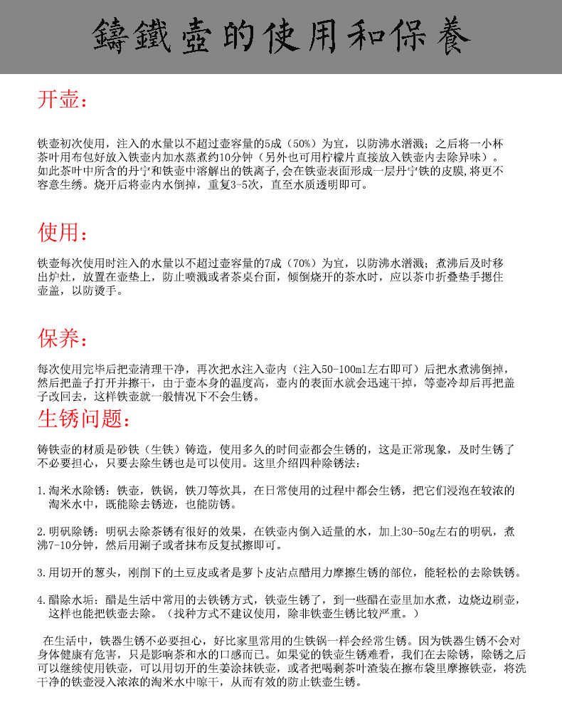 注:鐵壺為生鐵人工鑄造,使用保養不當會出現生銹情況。購買前請仔細閱讀詳情頁中的使用和保養說明,不接受因生銹及手工鑄造產生的些許遺留痕跡為理由的退換貨。介意慎拍!拍下默認視為同意此約定。