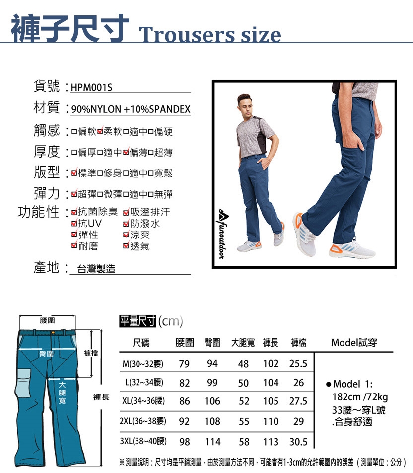 ** 試穿建議 : 173cm/73kgs, 實量腰圍 33腰, 褲子穿著XL腰, 寬鬆舒適.