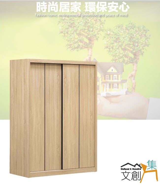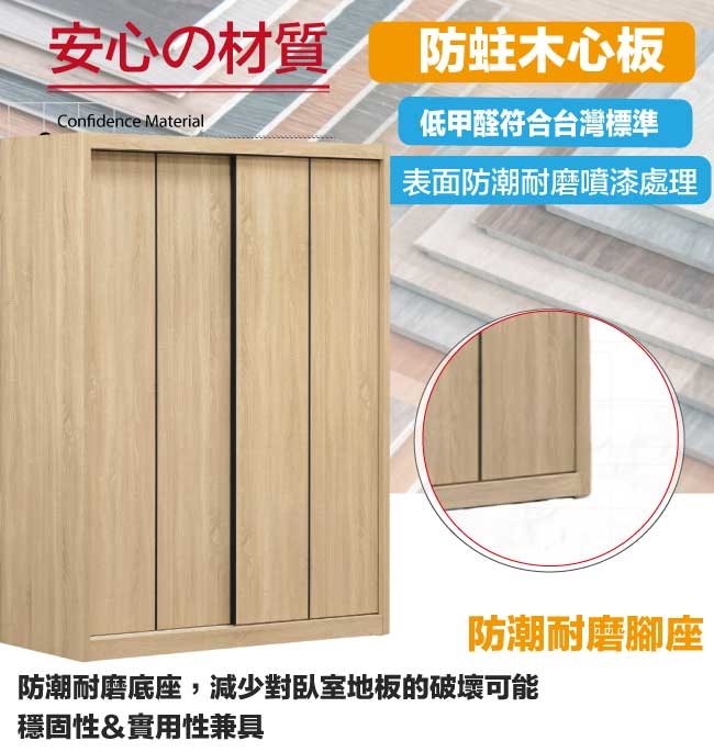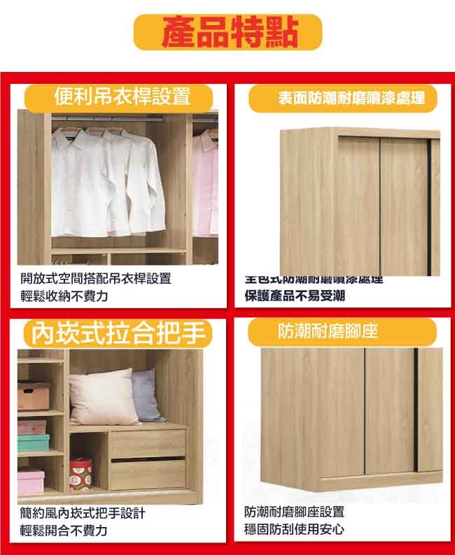 【文創集】路思樂5.2尺推門衣櫃 橡木紋色系+現代簡約風格+安心材質製造,使用放心+搭配居家更便利,整體採用防蛀木心板+防潮耐磨底座+五金滑軌結構+等材質搭配外層採用優莉坦耐磨全包式噴漆處理 ,採用開門櫃+吊衣桿+二抽屜+內開放式收納等收納空間設計,全由專人配送到家,專業安心服務,替你省下更多時間!